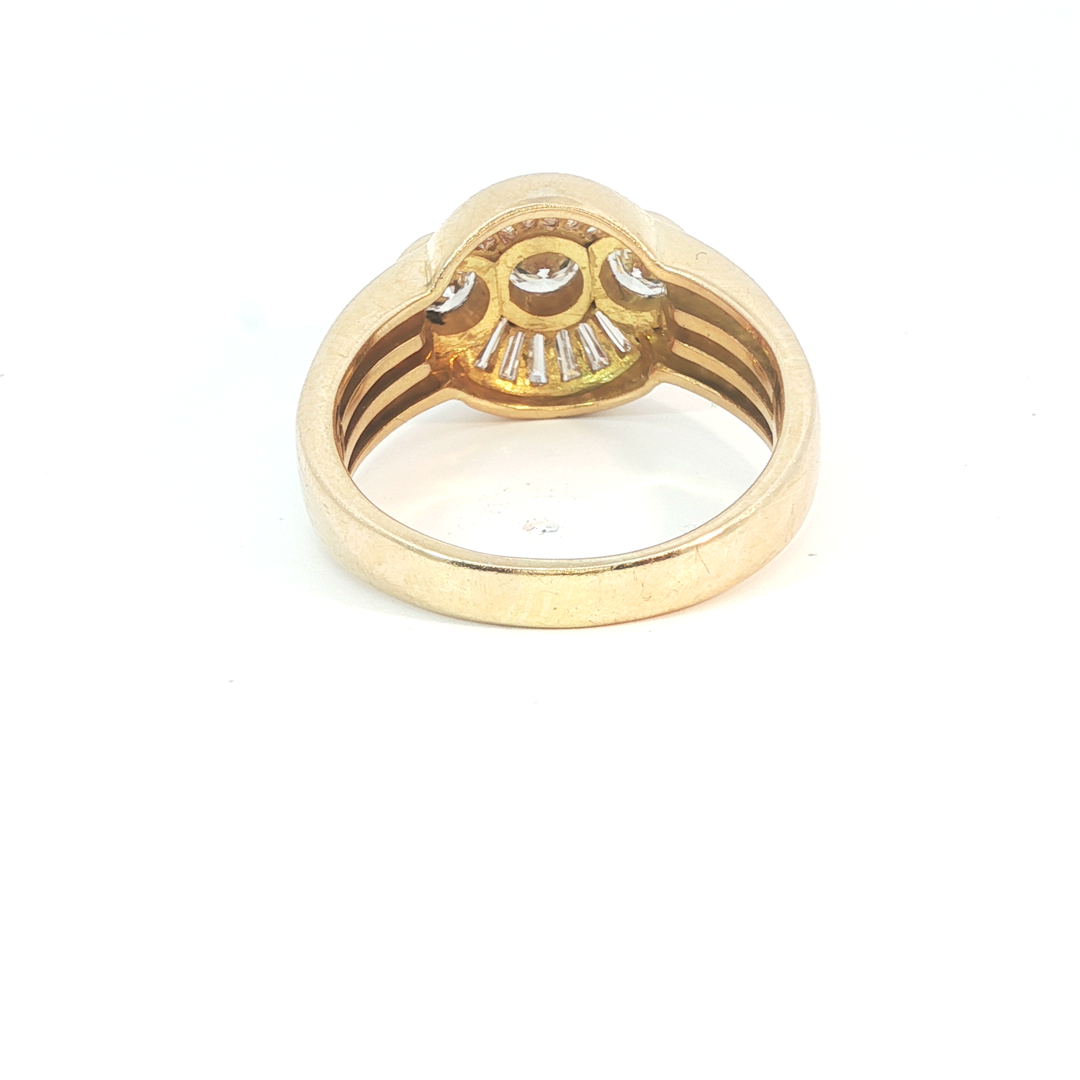 This exquisite 18k gold cluster ring showcases a stunning arrangement of 1.95 carats of premium diamonds. The centrepiece features three round brilliant cut diamonds (0.8ct, VS clarity, G-H colour) surrounded by twelve elegant tapering baguettes (0.55ct). The yellow gold shoulders are adorned with forty additional round brilliants in a channel setting, creating a sophisticated graduated design. Each diamond is carefully selected for exceptional clarity and colour, making this a timeless piece perfect for special occasions or as a cherished heirloom.