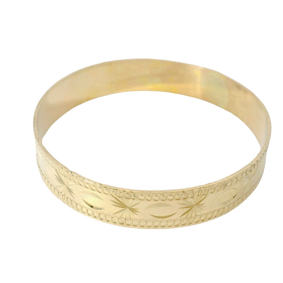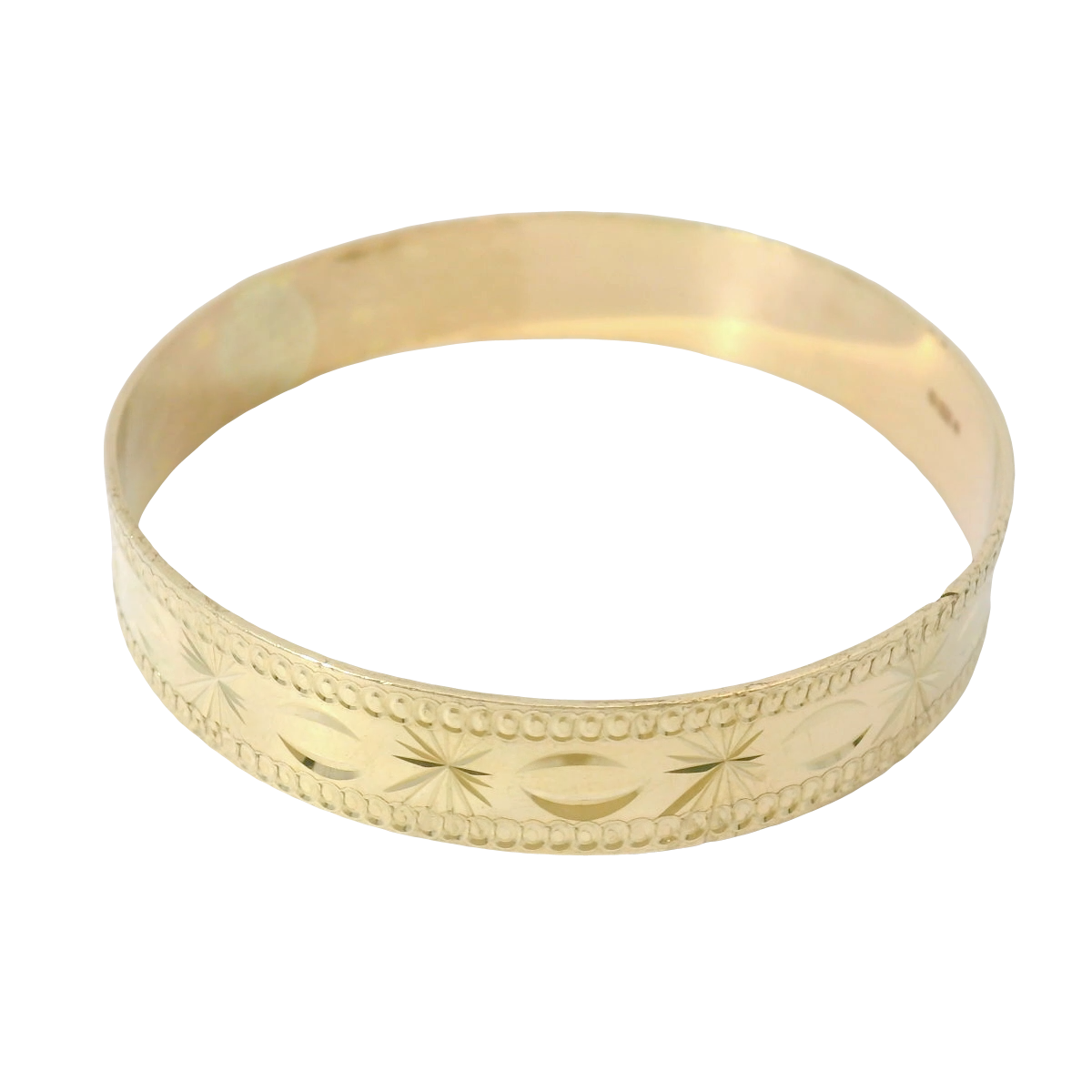 This pre-owned 9CT gold patterned slave bangle features elegant decorative detailing across its 5.5-inch circumference. Weighing 9.42g, this piece offers substantial gold content while maintaining a refined aesthetic. The traditional slave bangle design ensures a secure and comfortable fit, making it suitable for everyday wear while its intricate pattern adds distinctive character to any jewellery collection. The band is 9mm wide with a 1mm thickness.