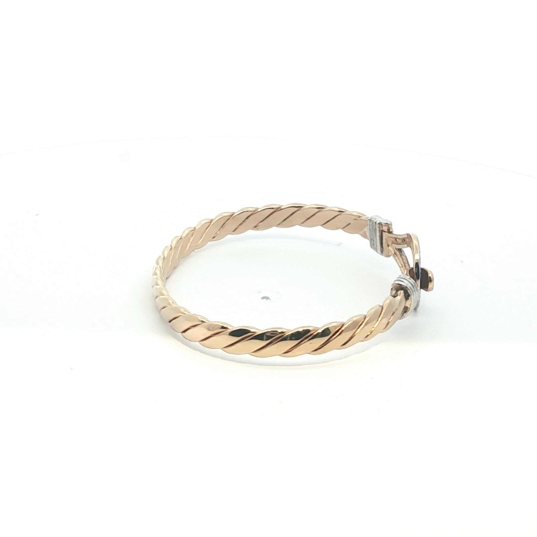 This elegant pre-owned 9ct gold bangle features a refined hook closure and delicate stone settings, combining timeless design with practical wearability. Weighing 13.86g, it offers substantial quality in a graceful 5.5'' size. Perfect for those who appreciate vintage jewellery with enduring appeal, this piece brings understated luxury to any collection. As a pre-owned treasure, it carries its own unique character and history.