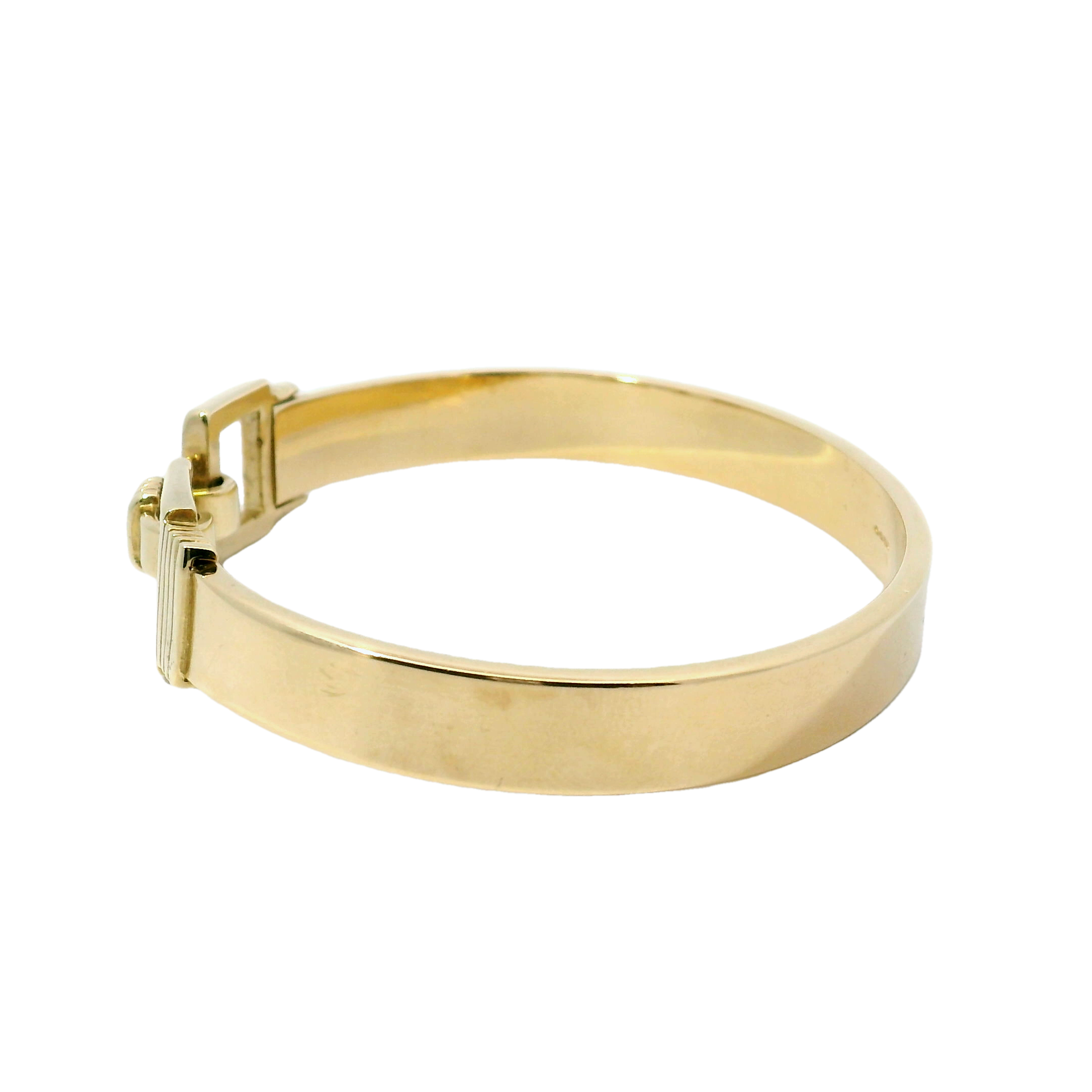 Expertly crafted with a 6.5" hook and loop design, this 9CT bangle weighing 31.9g is a pre-owned luxury piece. It offers the perfect mix of style and durability, making it a timeless addition to any jewellery collection. Elevate your look with this elegant and versatile bangle. The band is 8mm wide by 2mm in thickness.