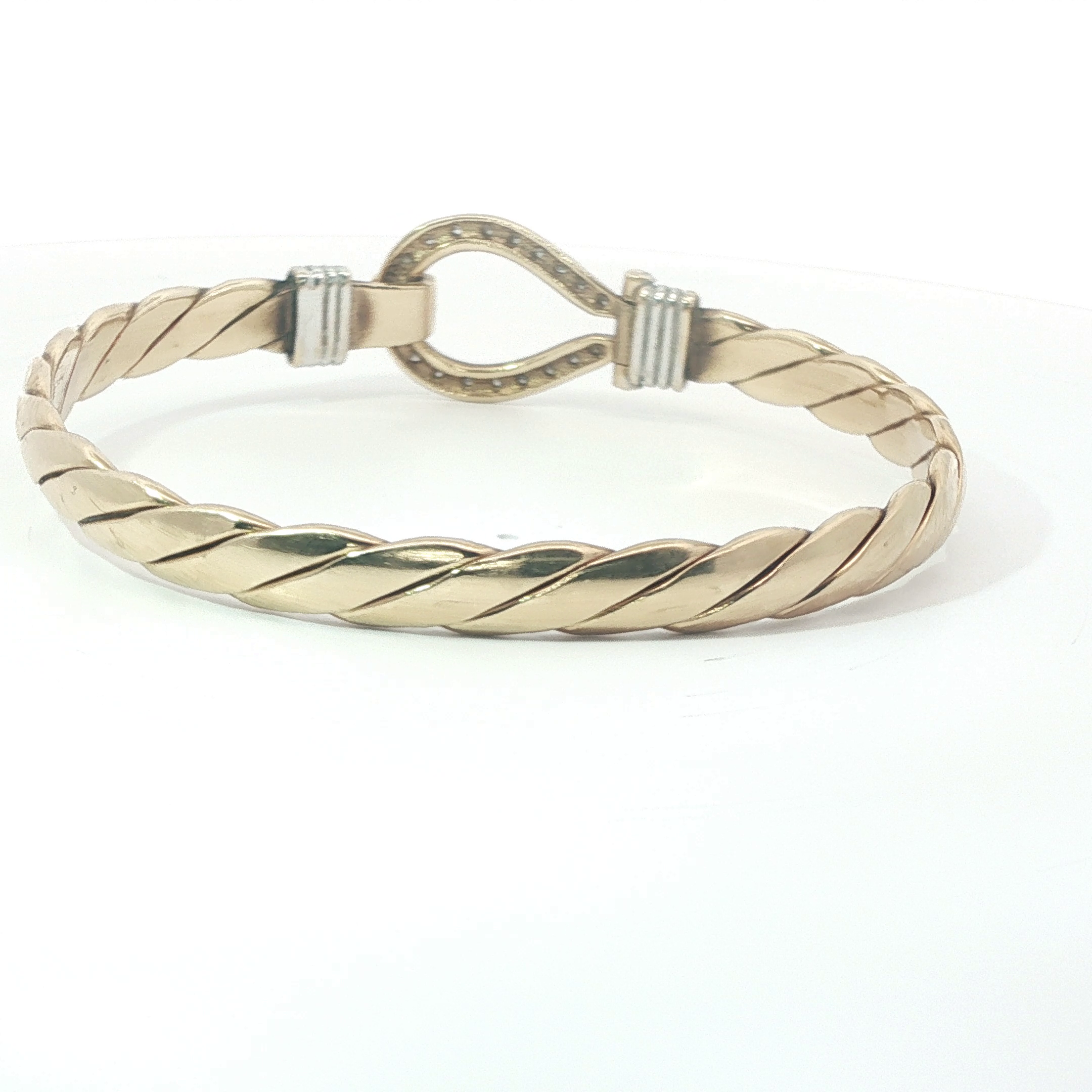 This pre-owned 9ct gold hook bangle combines timeless elegance with practical wearability. Measuring 6.75 inches, it's sized to suit most wrists comfortably. The stone-set design adds refined sparkle, whilst the secure hook closure ensures reliable fastening. Weighing 23.85g, this piece offers substantial gold content with genuine craftsmanship. As a pre-owned item, it represents excellent value for collectors and those seeking quality jewellery with character and history.