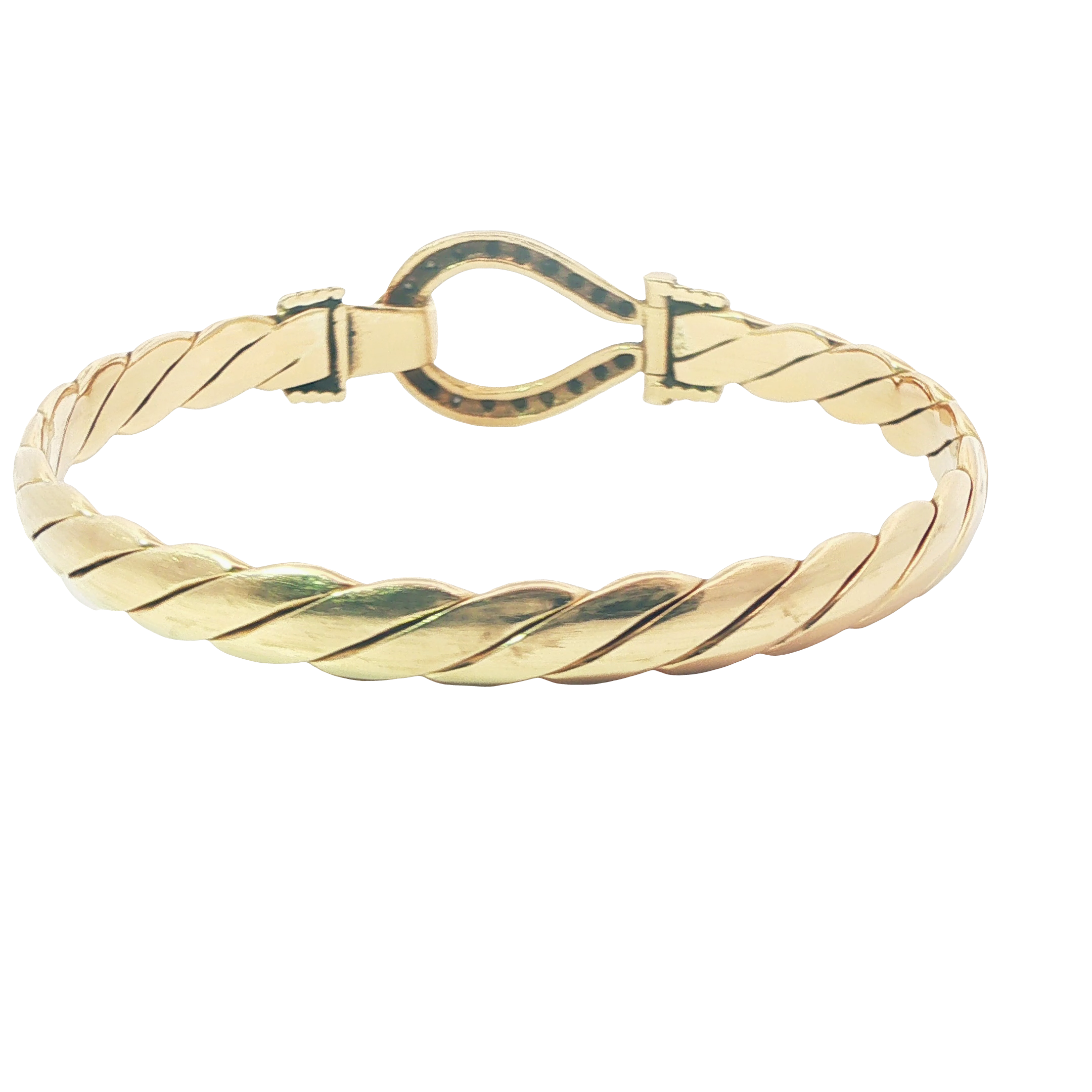 This elegant pre-owned 9CT gold bangle features a sophisticated hook and loop closure with stone settings throughout. Weighing 21.58g, it offers substantial presence on the wrist whilst maintaining refined proportions. The 6.75" circumference suits most wearers comfortably. As a pre-owned piece, it carries the character of established jewellery with the assurance of genuine 9 carat gold craftsmanship. An excellent choice for those seeking quality vintage jewellery with timeless appeal and practical everyday wearability.