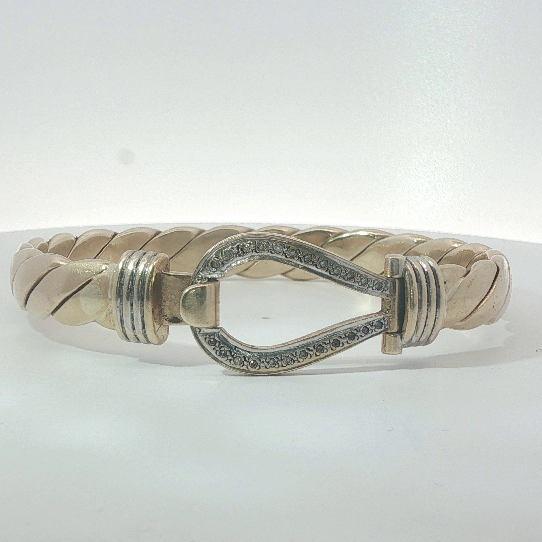 This elegant 7.75" pre-owned 9ct gold hook bangle features carefully set stones, combining classic design with lasting quality. Weighing 65.43 grams, it offers substantial presence and durability, making it a timeless addition to any jewellery collection. Ideal for those seeking refined craftsmanship and understated sophistication.