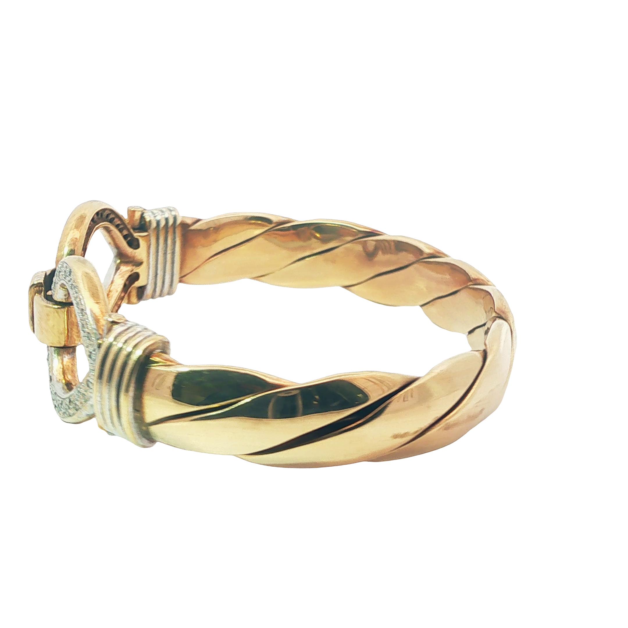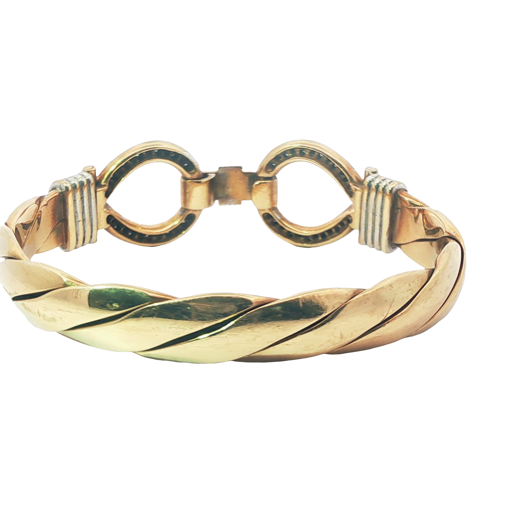 This elegant pre-owned bracelet showcases the timeless appeal of 9-carat gold craftsmanship. Measuring 8.25 inches, it features a distinctive double hook and loop closure mechanism that combines security with refined aesthetics. The stone-set design adds sophisticated sparkle, with carefully selected gemstones complementing the warm lustre of 9CT gold. Weighing 97.65 grams, this substantial piece offers genuine weight and presence on the wrist. As a pre-owned item, it carries character and history whilst representing excellent value for discerning jewellery collectors. An ideal choice for those seeking quality gold jewellery with enduring style.