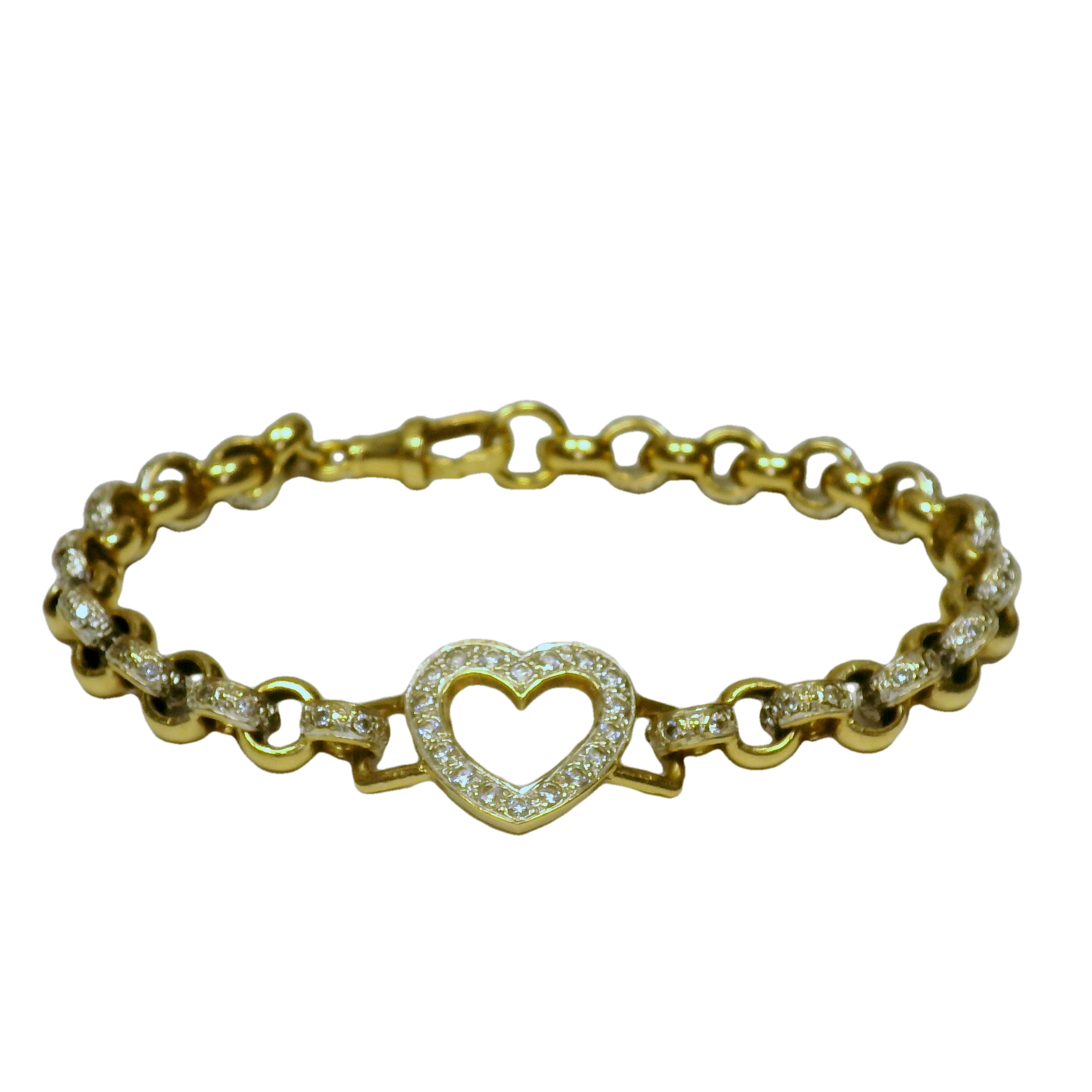 Expertly crafted, this 8" pre-owned 9CT stone set heart belcher bracelet weighs 18.4g and is designed to add a touch of elegance to any outfit. The heart charm is adorned with sparkling stones, giving it a delicate and stunning look. The perfect accessory for any occasion. The links are 7mm wide x 3mm in thickness.