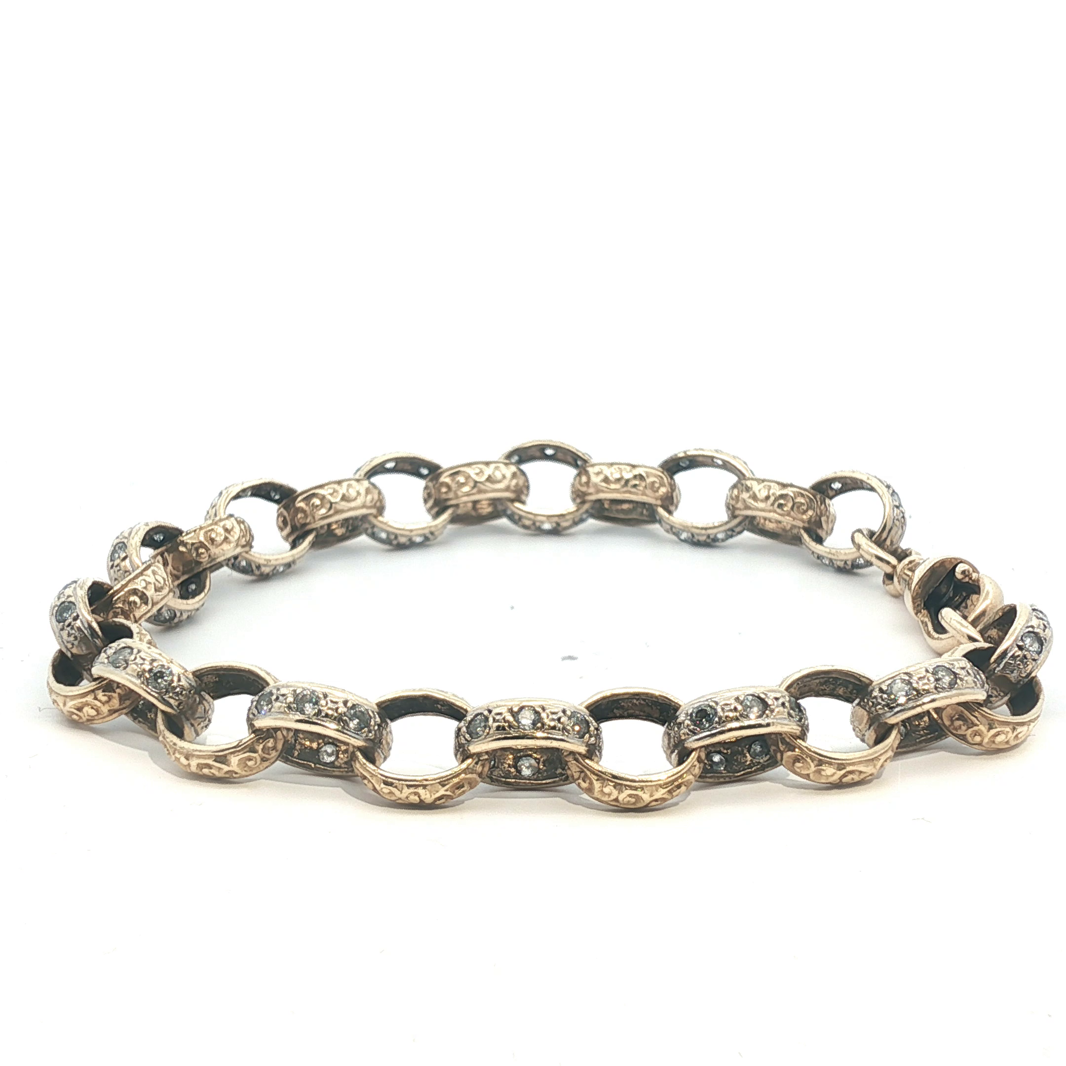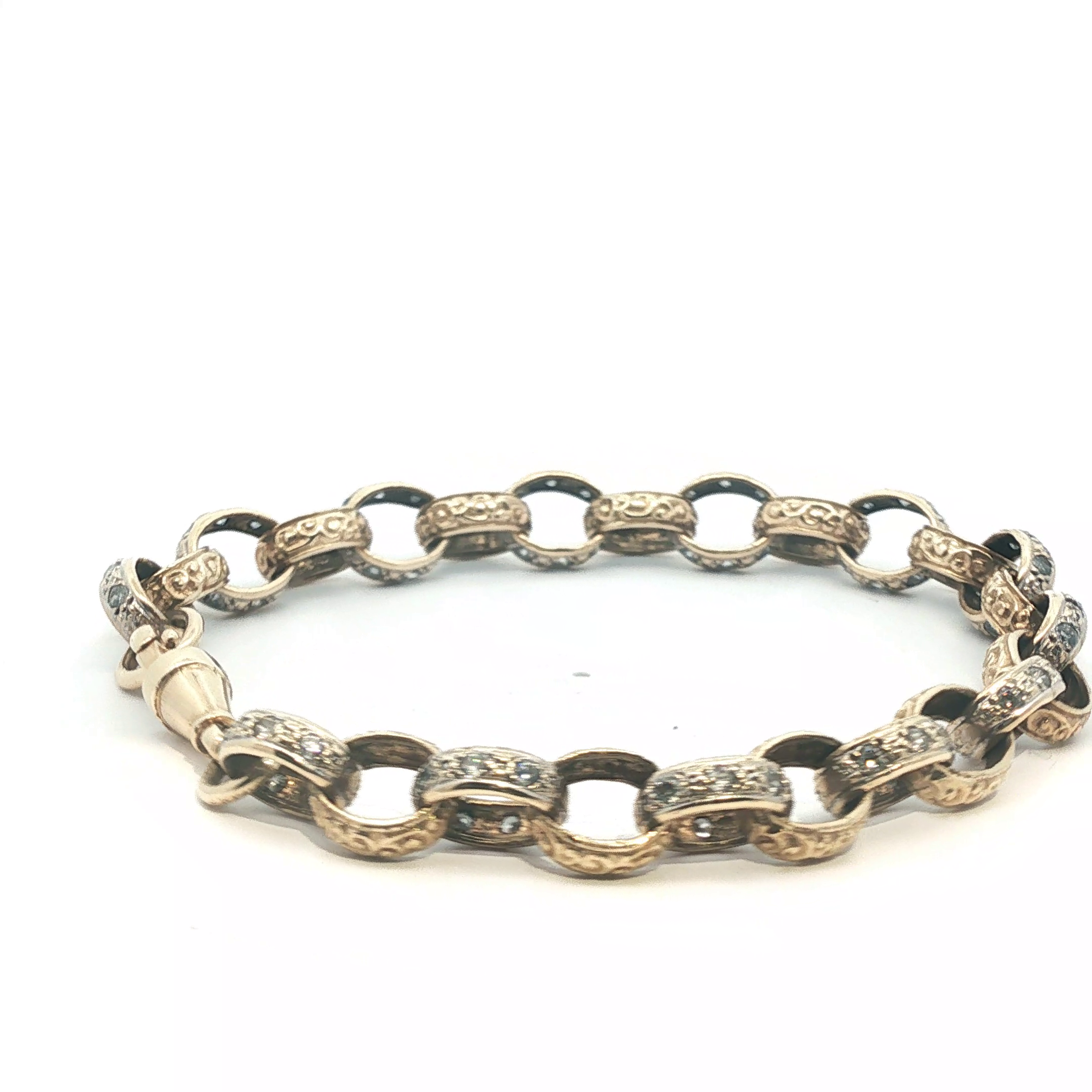This elegant pre-owned belcher bracelet showcases timeless craftsmanship in 9-carat gold. Weighing 32.65g, the piece features a classic interlocking link design complemented by carefully set stones that catch the light beautifully. At 9.5 inches, it offers a comfortable fit for most wrists. As a pre-owned item, it carries the character and patina of a well-loved treasure, making it an excellent choice for those seeking authentic luxury with a conscientious approach. A sophisticated addition to any jewellery collection.