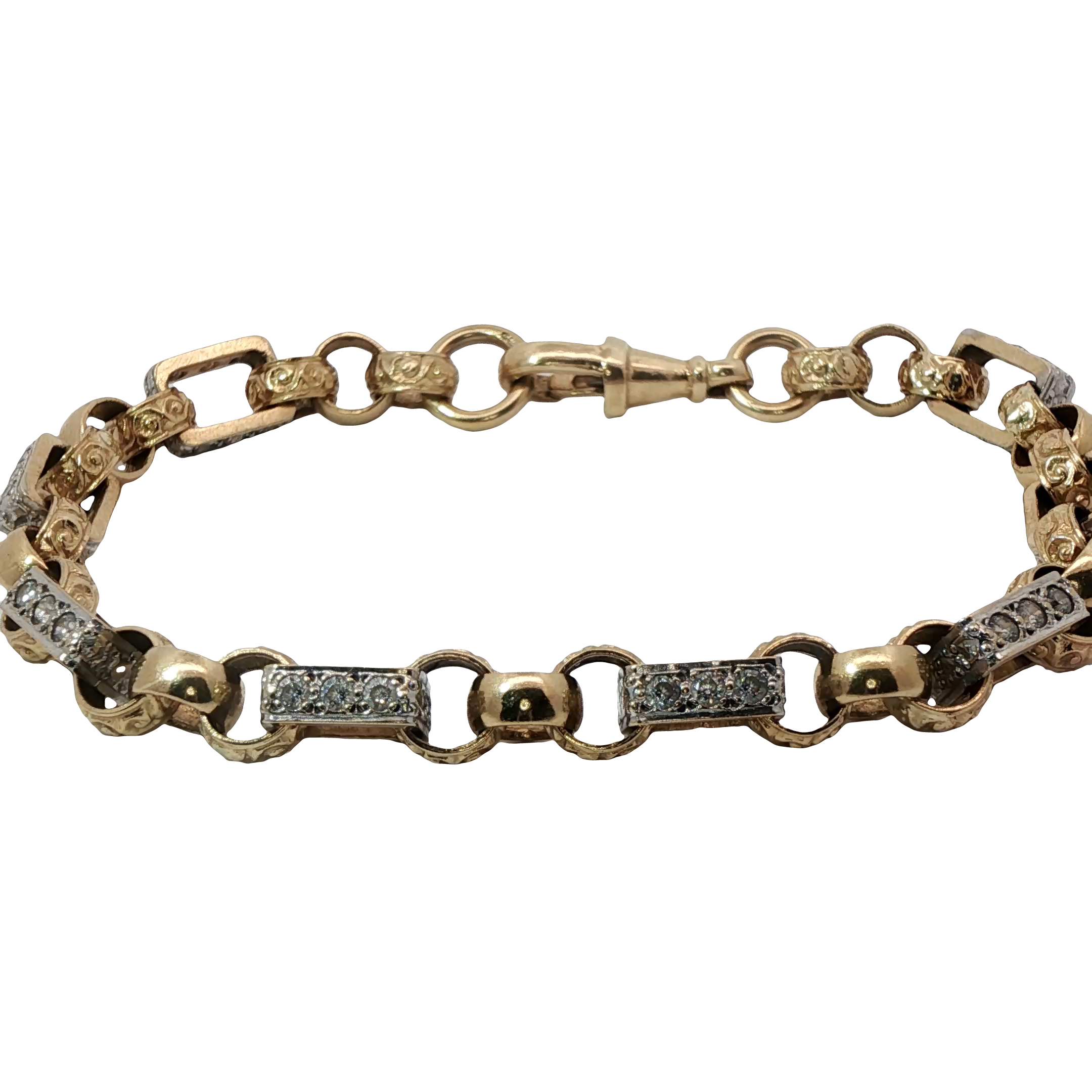 This remarkable chain bracelet is expertly crafted in polished yellow gold, featuring distinctive links. Rectangular links are set with round cut CZ's displaying impressive brilliance. The bracelet embodies luxury with unique design elements, showcasing a harmonious blend of classic charm and sophisticated elegance.