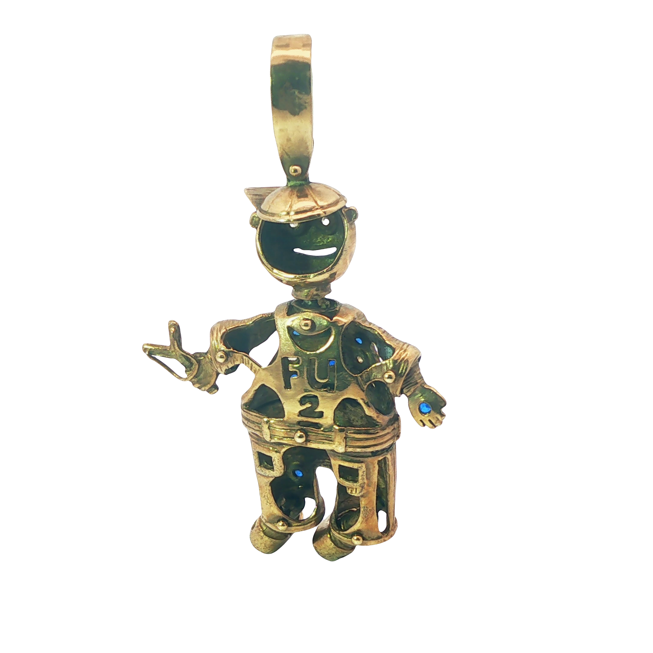 This distinctive 9CT gold pendant captures a playful moment with its slingshot boy design, crafted with expert precision. Weighing 23.05g, it offers substantial presence and quality in solid gold construction. As a pre-owned piece, it combines character and value, making it an excellent choice for collectors seeking unique jewellery with authentic charm. The detailed craftsmanship showcases the artistry of its era, while the 9CT gold ensures durability for everyday wear or special occasions. A conversation-starting accessory that blends nostalgia with timeless elegance.