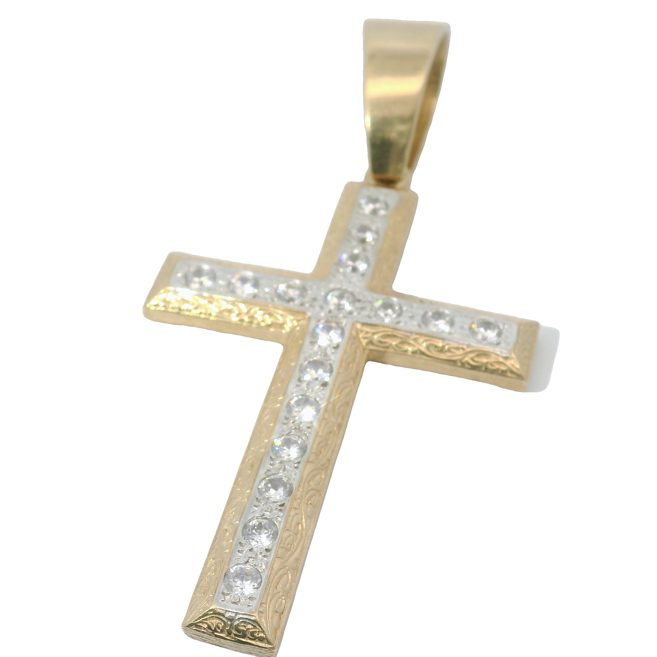 This 9CT Pre-owned Stone Set Cross (27.4g) is a stunning piece that combines elegance with durability. The 9CT gold provides a luxurious feel while the stone setting adds a touch of sparkle. With a weight of 27.4g, this cross is substantial and perfect for everyday wear. A beautiful addition to any jewellery collection. From top of bale to the bottom of the pendant is 90mm with a width of 45mm.
