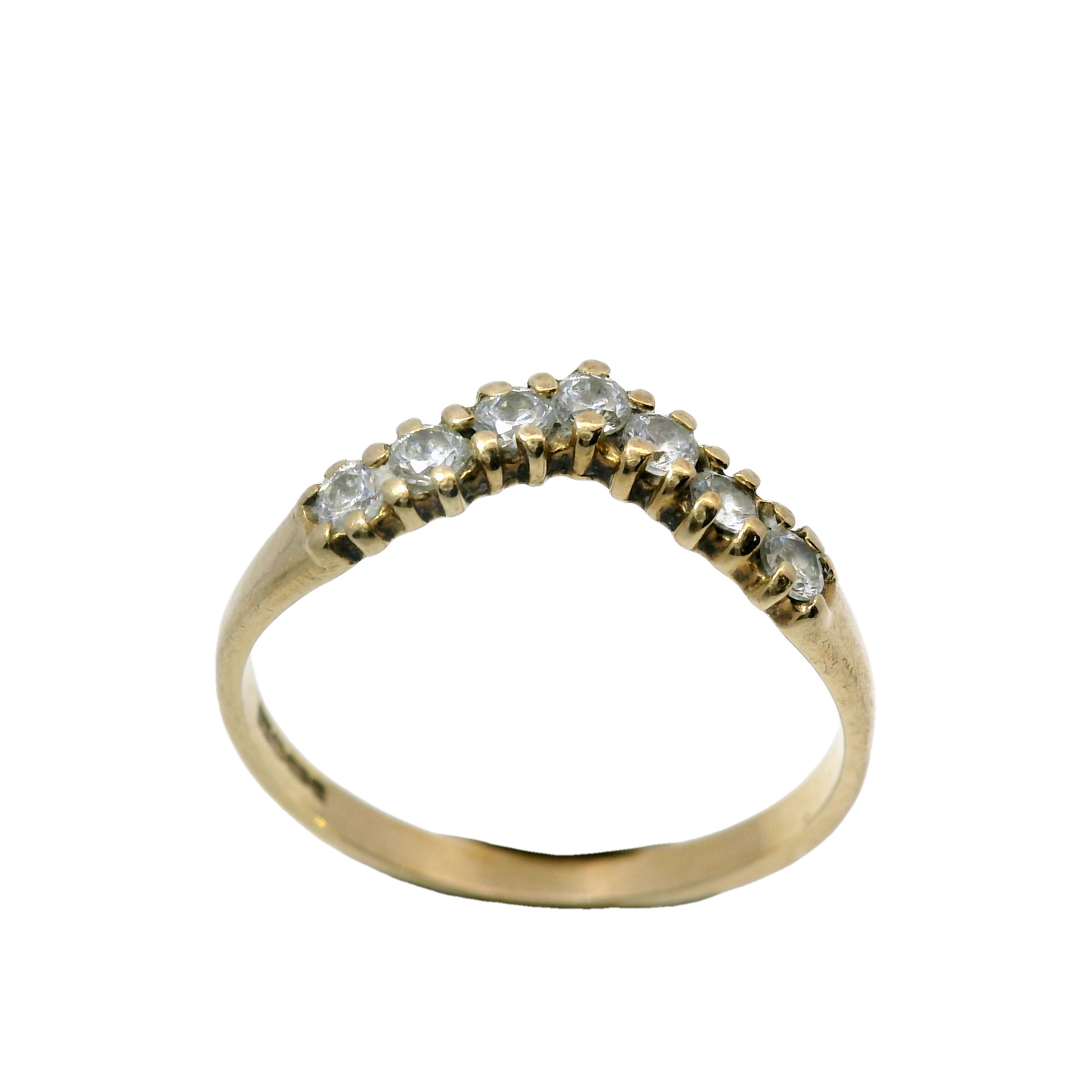 This pre-owned 9CT stone set wishbone ring in size J is the perfect addition to your jewelry collection. Crafted with expertise and precision, this ring boasts a unique wishbone design adorned with beautiful stones. Elevate any outfit with this stunning and one-of-a-kind piece. The band is 2mm wide by 1.5mm in thickness.