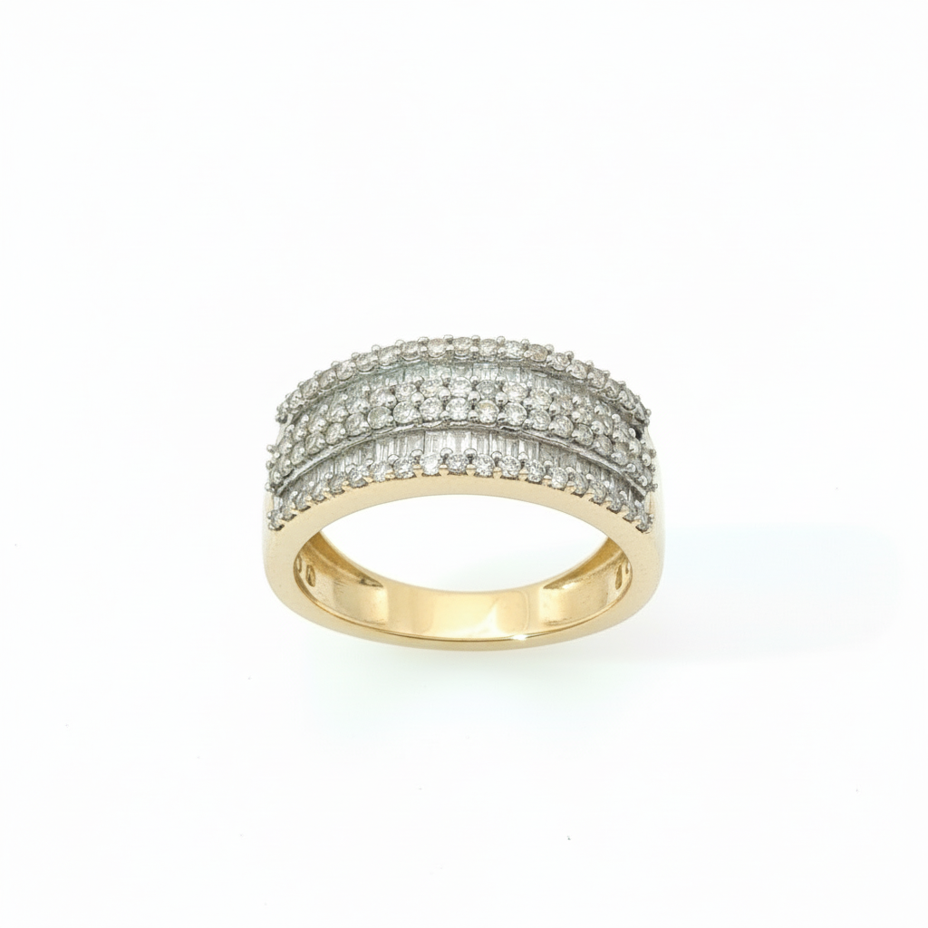 This expertly crafted 9CT yellow gold ring features a sophisticated blend of baguette and single cut diamonds totaling 1 carat, with clarity ranging from SI1 to SI2 and color graded G-H. The channel and prong setting securely showcases the stones, enhancing their brilliance and offering enduring elegance. Designed to sit comfortably at size J, this piece combines refined design with exceptional craftsmanship, ideal for those seeking a timeless and high-quality diamond ring.