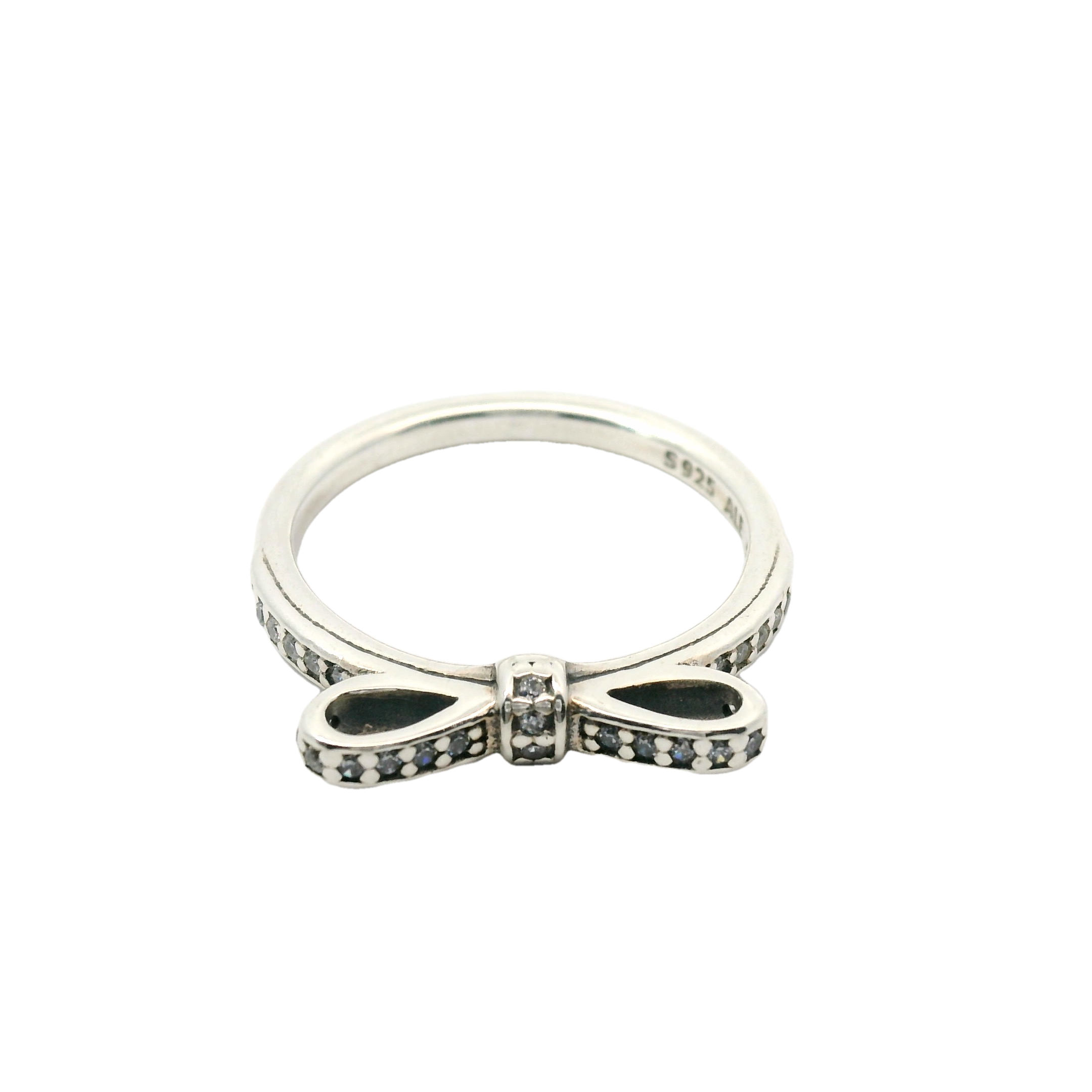 The Genuine PANDORA SPARKLING BOW Silver RING features a stunning bow design with sparkling cubic zirconia accents. Crafted from genuine silver, this ring adds a touch of elegance to any outfit. Size 16.5, L-L1/2, 52 European. Elevate your style with this exquisite PANDORA piece.