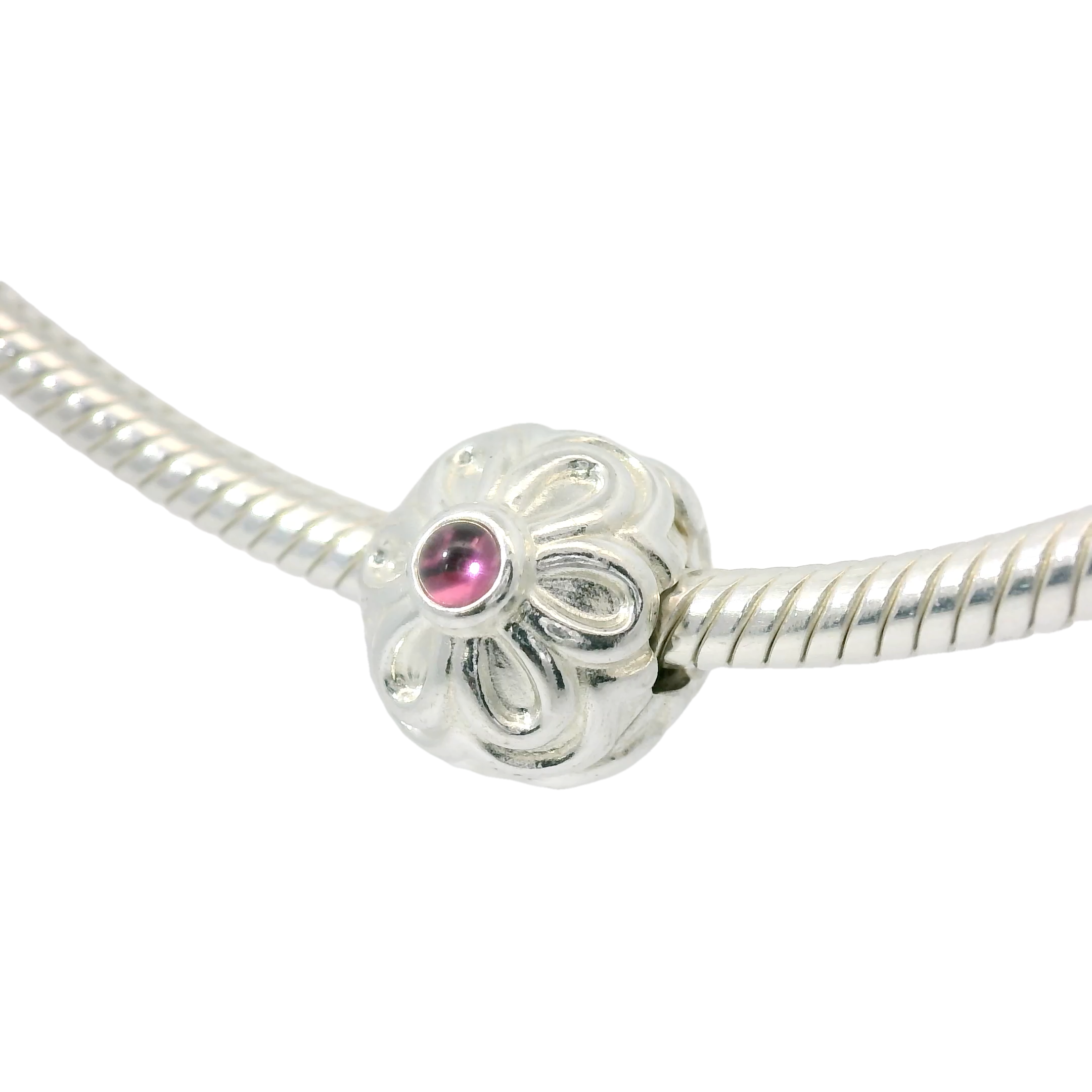 Introducing the Genuine PANDORA 790953RHL Rhodolite Zinnia Stopper Flower Clip Only. Made with genuine rhodolite, this stopper clip will add a touch of elegance to any bracelet. Its unique design ensures that charms stay in place while adding a pop of colour. A must-have for any PANDORA lover.