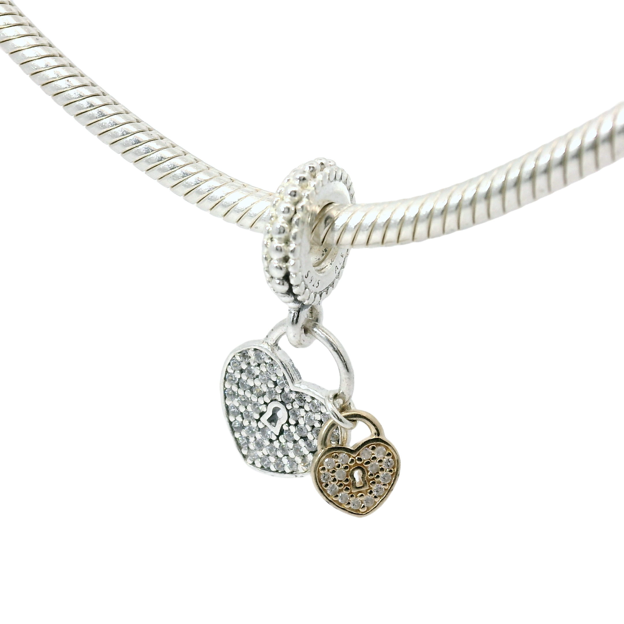 Add a touch of elegance to your bracelet with the Genuine PANDORA 791807CZ Silver & 14k Gold Padlocks Dangle Charm. Made with high-quality silver and gold, this charm features intricate padlock designs that symbolize security and commitment. Elevate your charm collection with this dainty yet meaningful addition.