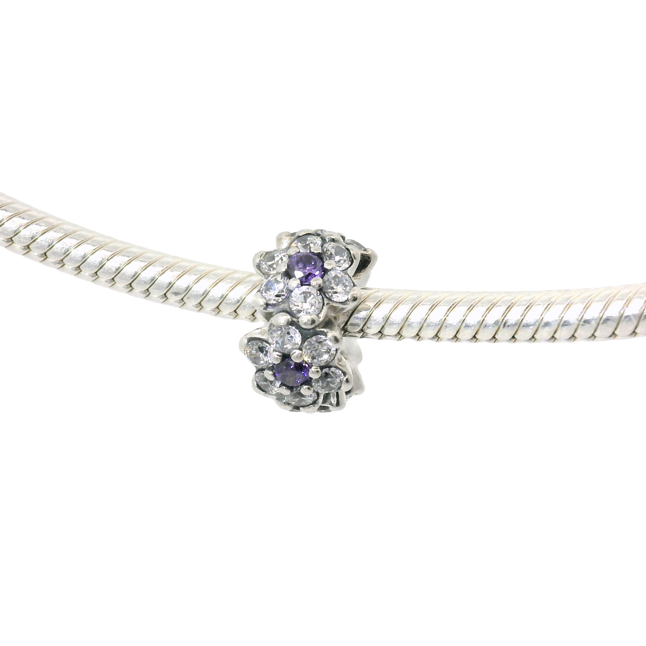 This authentic PANDORA charm features a stunning purple Forget Me Not flower design, adorned with sparkling cubic zirconia stones. Add a touch of elegance and meaning to your PANDORA bracelet with this unique and beautiful spacer charm. Perfect for gifting to a loved one or treating yourself.