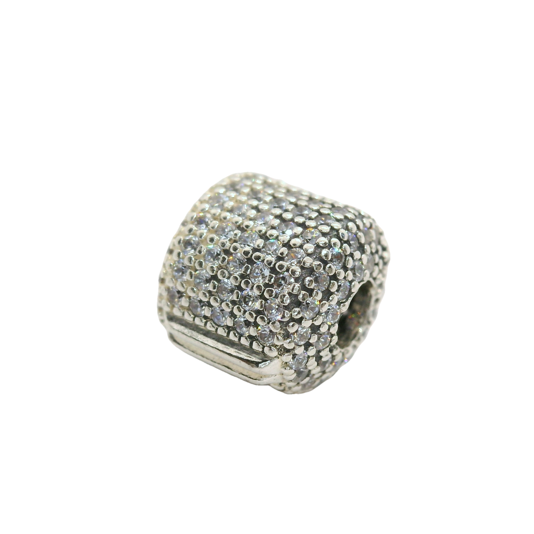 This Genuine PANDORA 791873CZ Pave Barrel Silver Clip Charm With Clear Zirconia adds a touch of elegance to any PANDORA bracelet or necklace. Made with sterling silver and adorned with sparkling clear zirconia, it securely clips onto your jewellery and enhances its beauty. A must-have for PANDORA lovers.