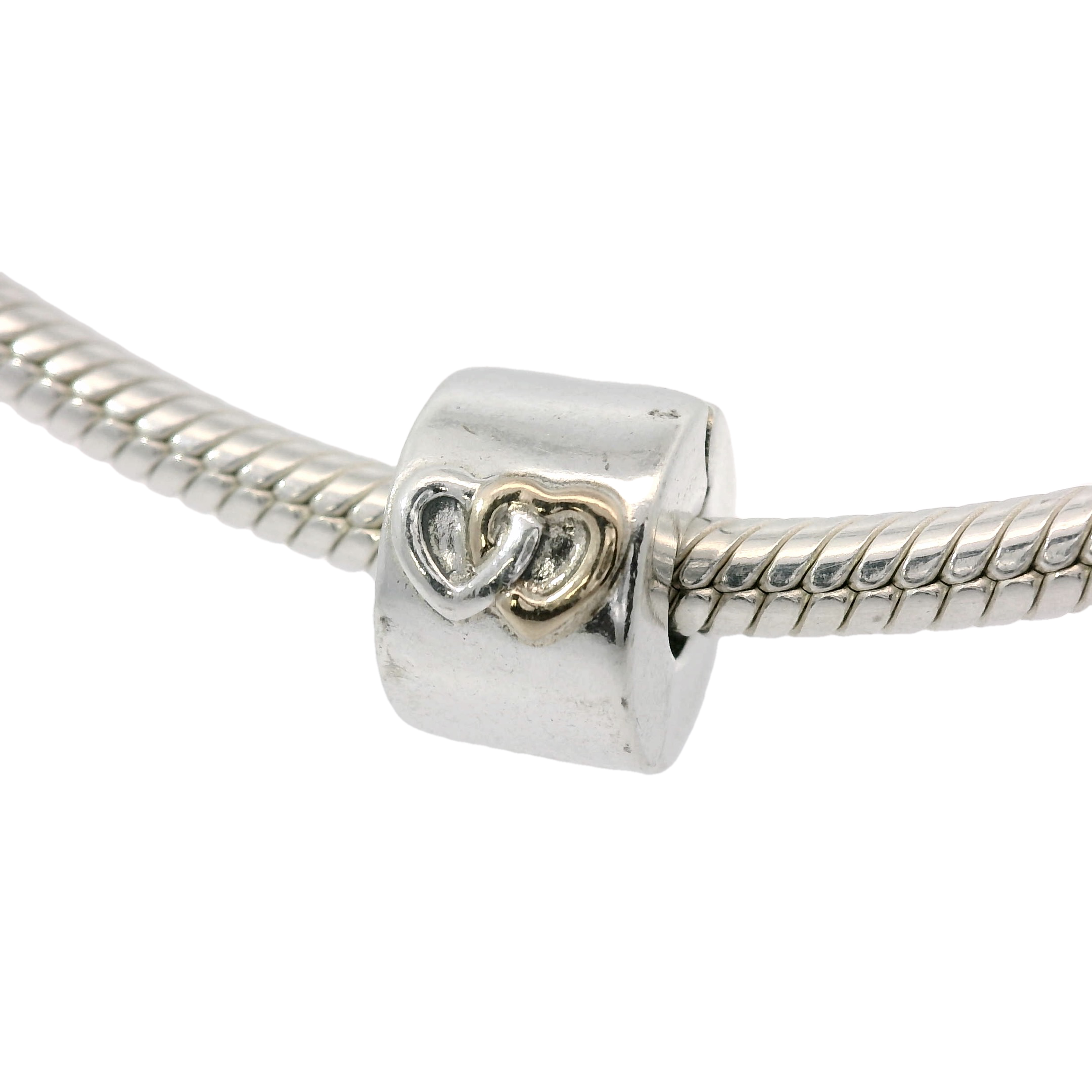 This Genuine PANDORA 796266 Sterling Silver & 14k Gold Interlocked Hearts Charm Clip is a stunning and versatile accessory. Crafted with high-quality materials, this clip features a unique interlocking hearts design for a touch of elegance. Perfect for keeping your charms in place while adding a touch of luxury to your PANDORA bracelet.