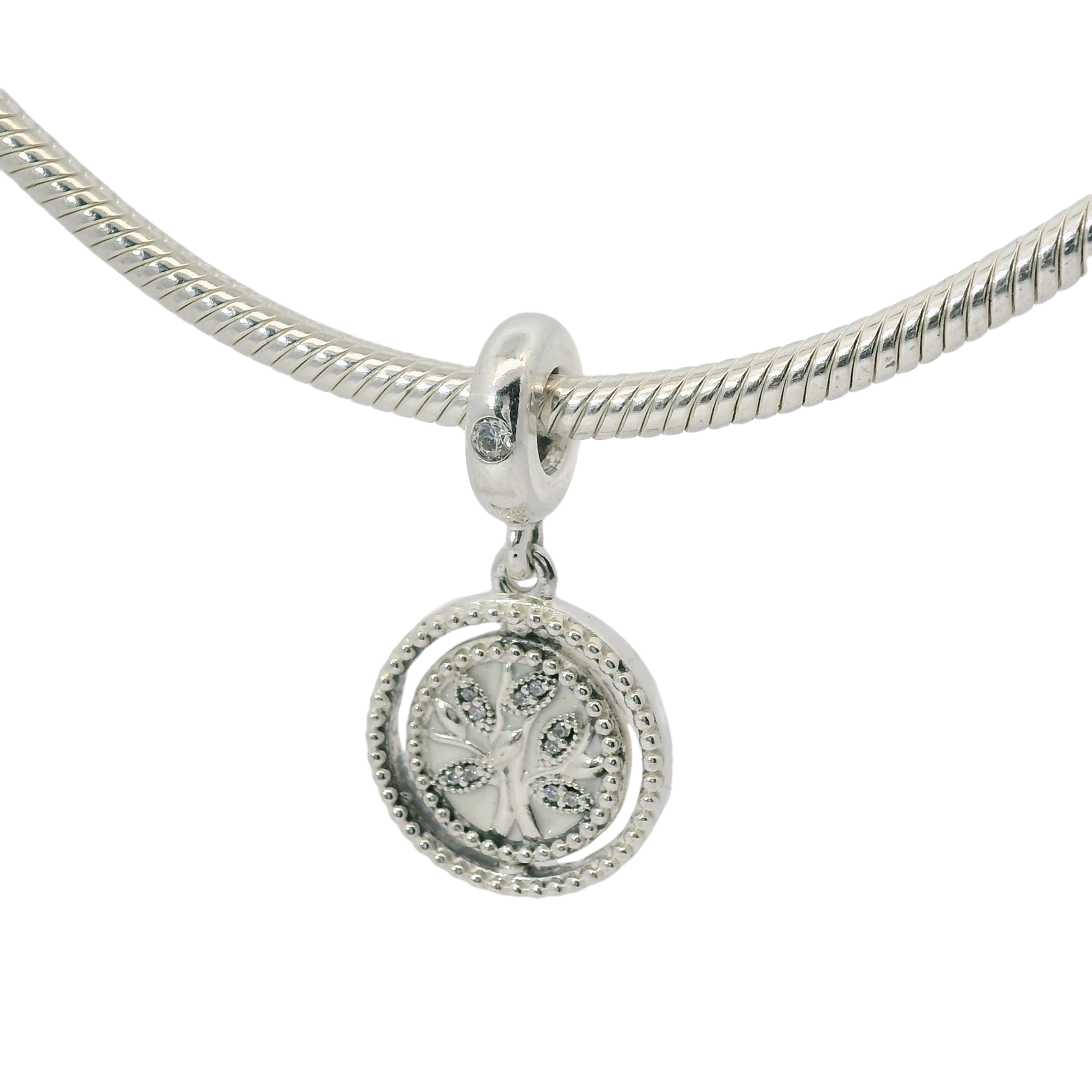 Enhance your PANDORA collection with the Sterling Silver Spinning Tree of Life Charm, handcrafted with precision and featuring genuine silver. This unique charm spins on its axis, symbolising the constant growth and connection of the Tree of Life. Add a touch of elegance and meaning to your charm bracelet.