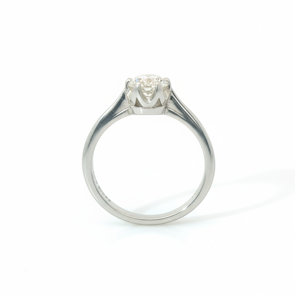 This exquisite solitaire ring features a 0.75-carat Old Mine Cut diamond with SI1 clarity and an L-M colour grade, showcasing classic brilliance and character. Set in a durable platinum basket setting, it offers lasting elegance and security. Sized at K, this ring combines vintage charm with expert craftsmanship, making it a refined choice for those who appreciate timeless design.