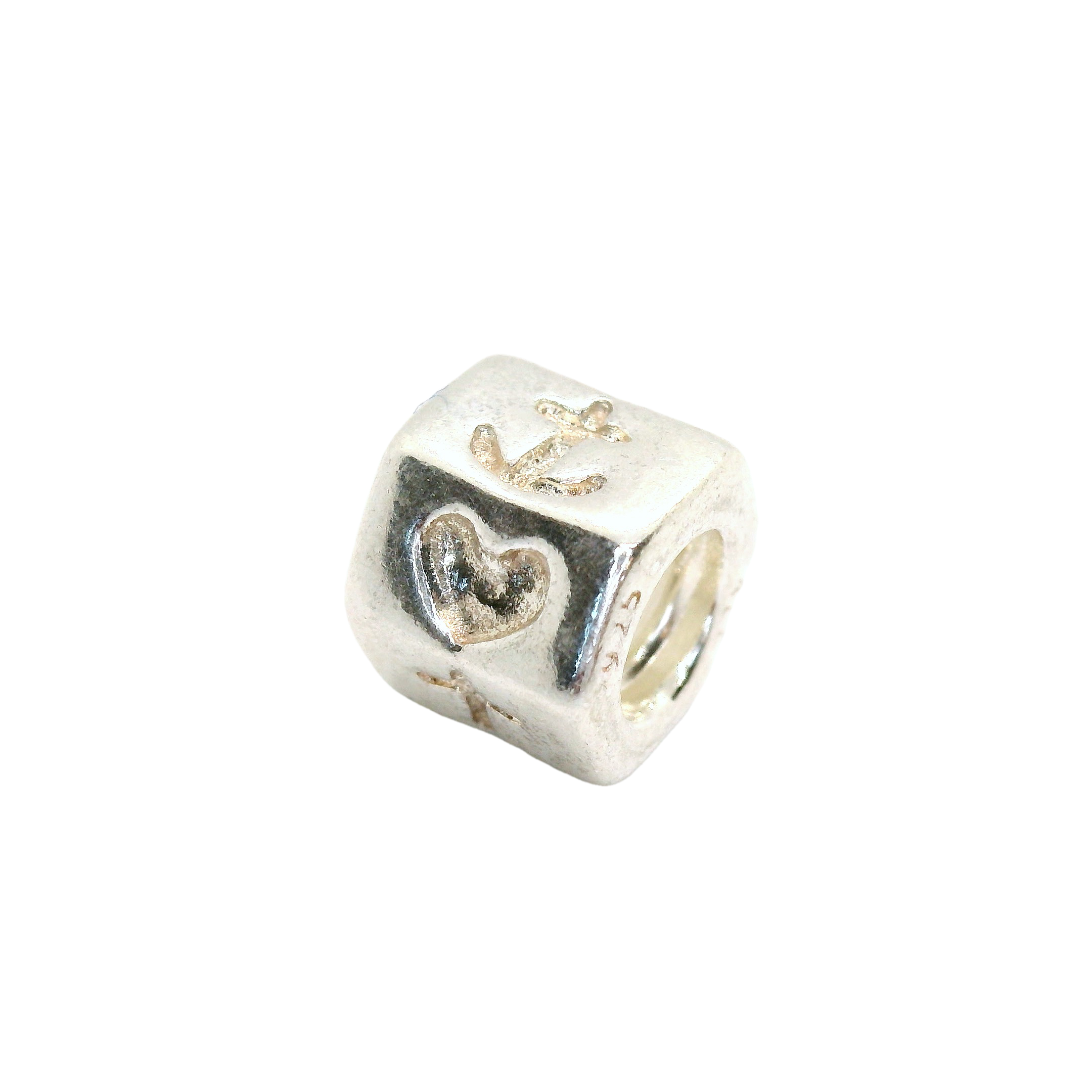 This exquisite silver charm features intricate engravings of a heart and an anchor, symbolising love and stability. Perfect for adding a touch of elegance to any bracelet or necklace, this charm is crafted with precision and care. Its versatile design makes it a timeless piece for any jewellery collection.