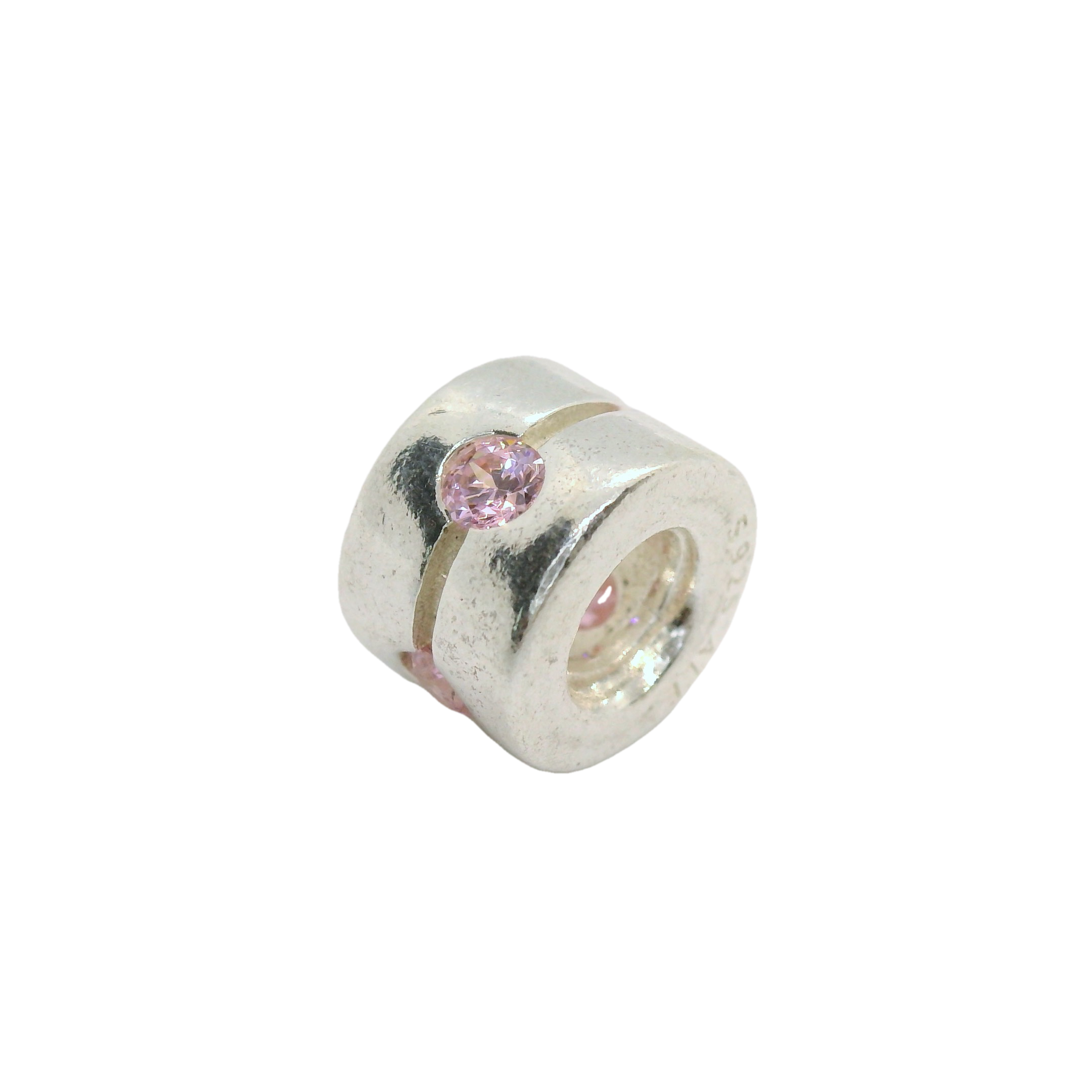 This exquisite silver charm is adorned with a delicate pink cubic zirconia's, adding a touch of elegance and sophistication to any Pandora bracelet or necklace. Its sleek design and shimmering finish make it a perfect accessory for both casual and formal occasions.