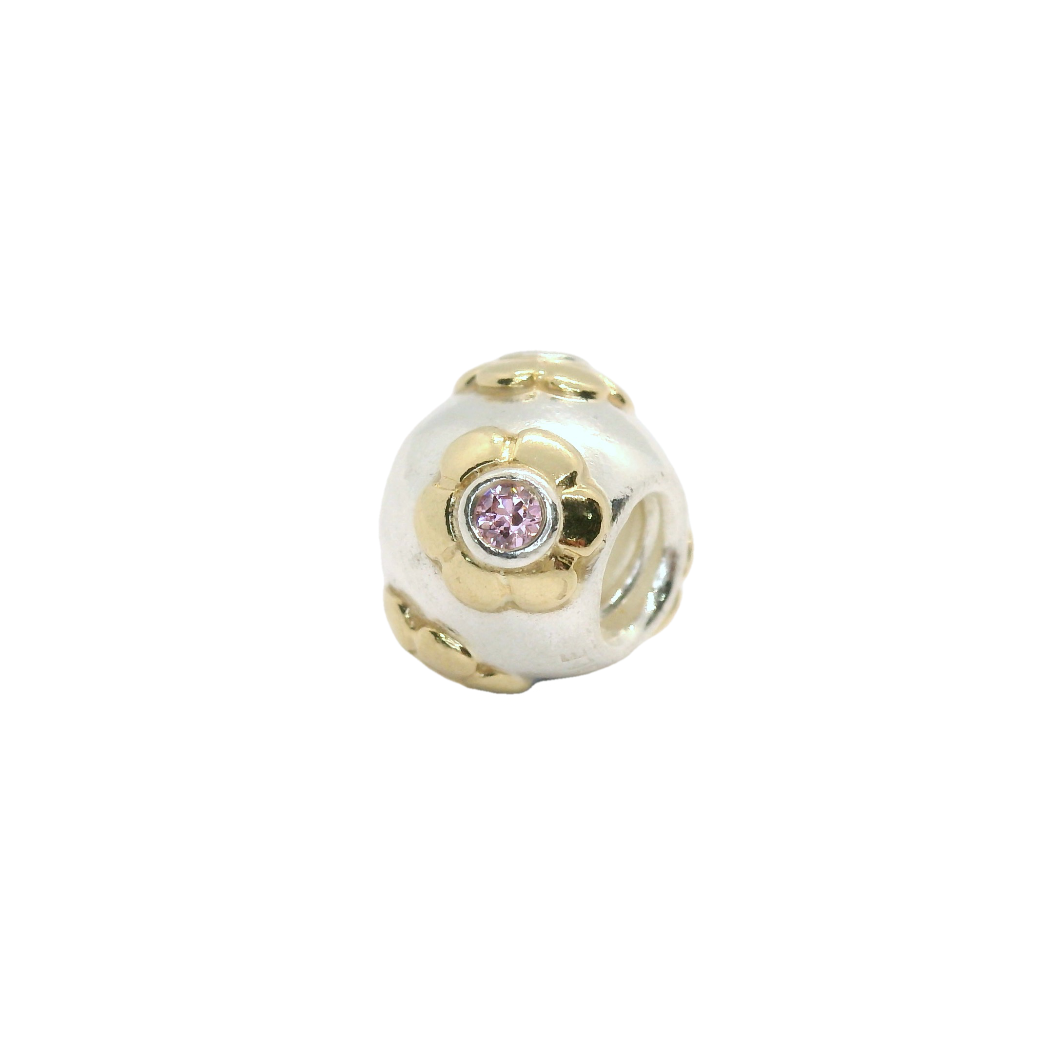 This exquisite Sterling Silver and 14K Gold charm bead features a delicate floral design, with shimmering pink zirconia's set in a golden flower pattern. Perfect for adding a touch of elegance to any bracelet or necklace, this bead is crafted with precision and attention to detail, making it a standout piece in any jewellery collection.