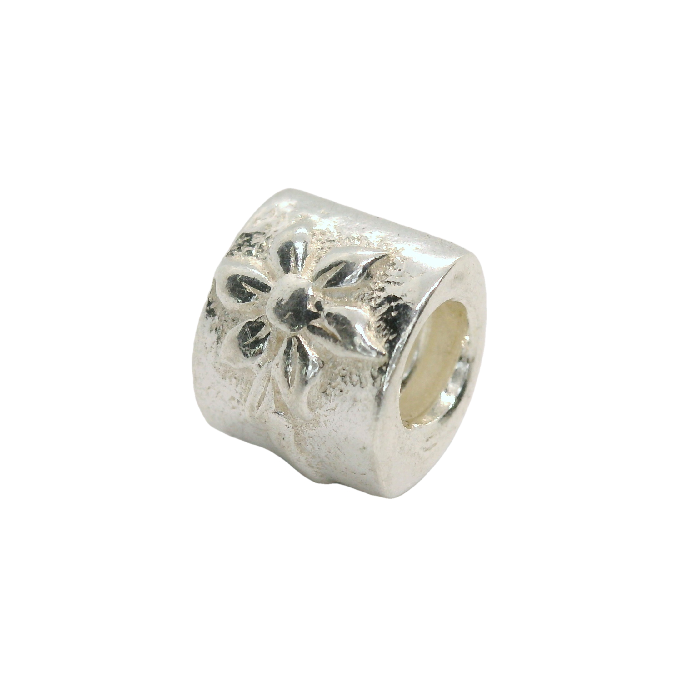 This exquisite silver charm bead features a delicate floral design, perfect for adding a touch of elegance to any bracelet or necklace. Its polished finish and intricate detailing make it a standout piece in any jewellery collection.