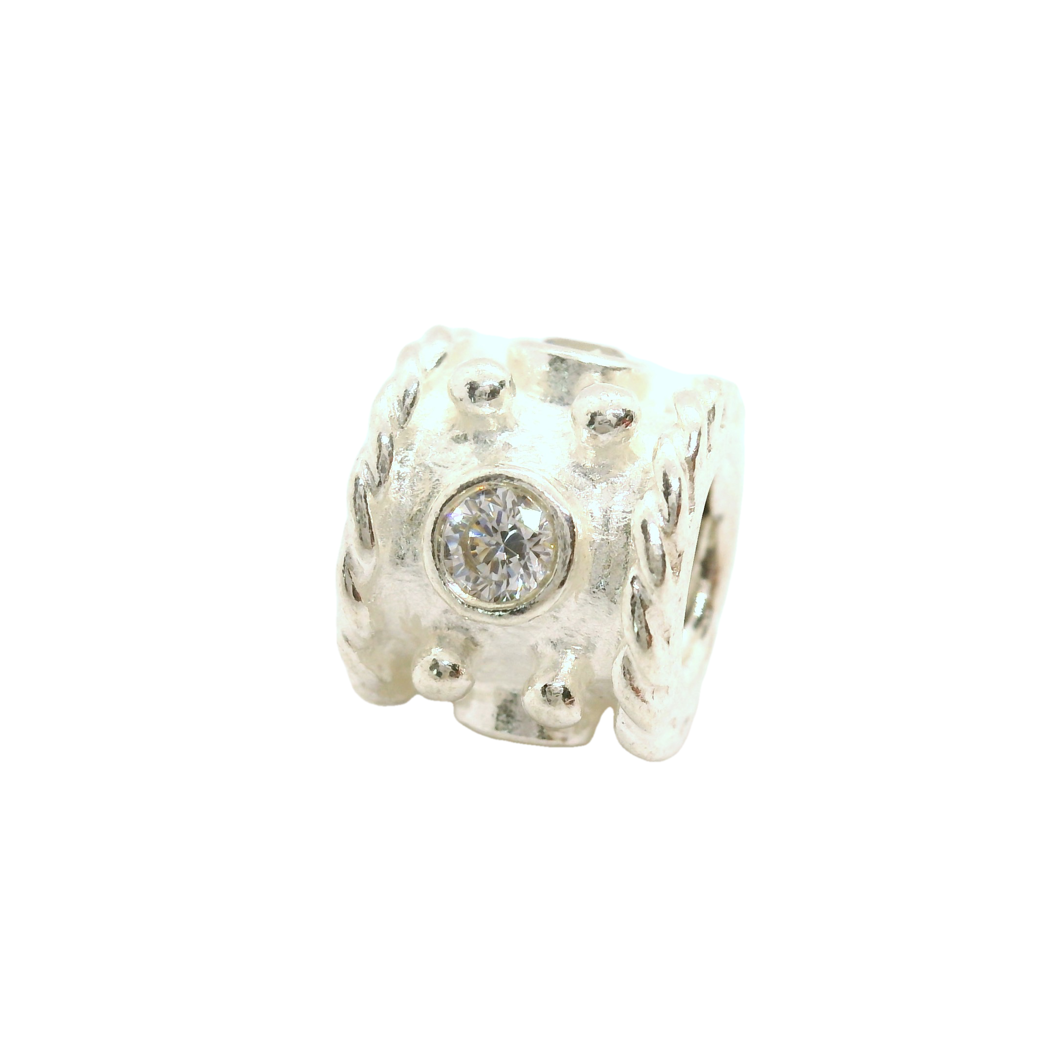 This exquisite silver charm features a beautifully set gemstone at its centre, surrounded by intricate detailing that adds a touch of elegance and sophistication. Perfect for adding a sparkling accent to any bracelet or necklace, this charm is a must-have for those who appreciate fine craftsmanship and timeless design.