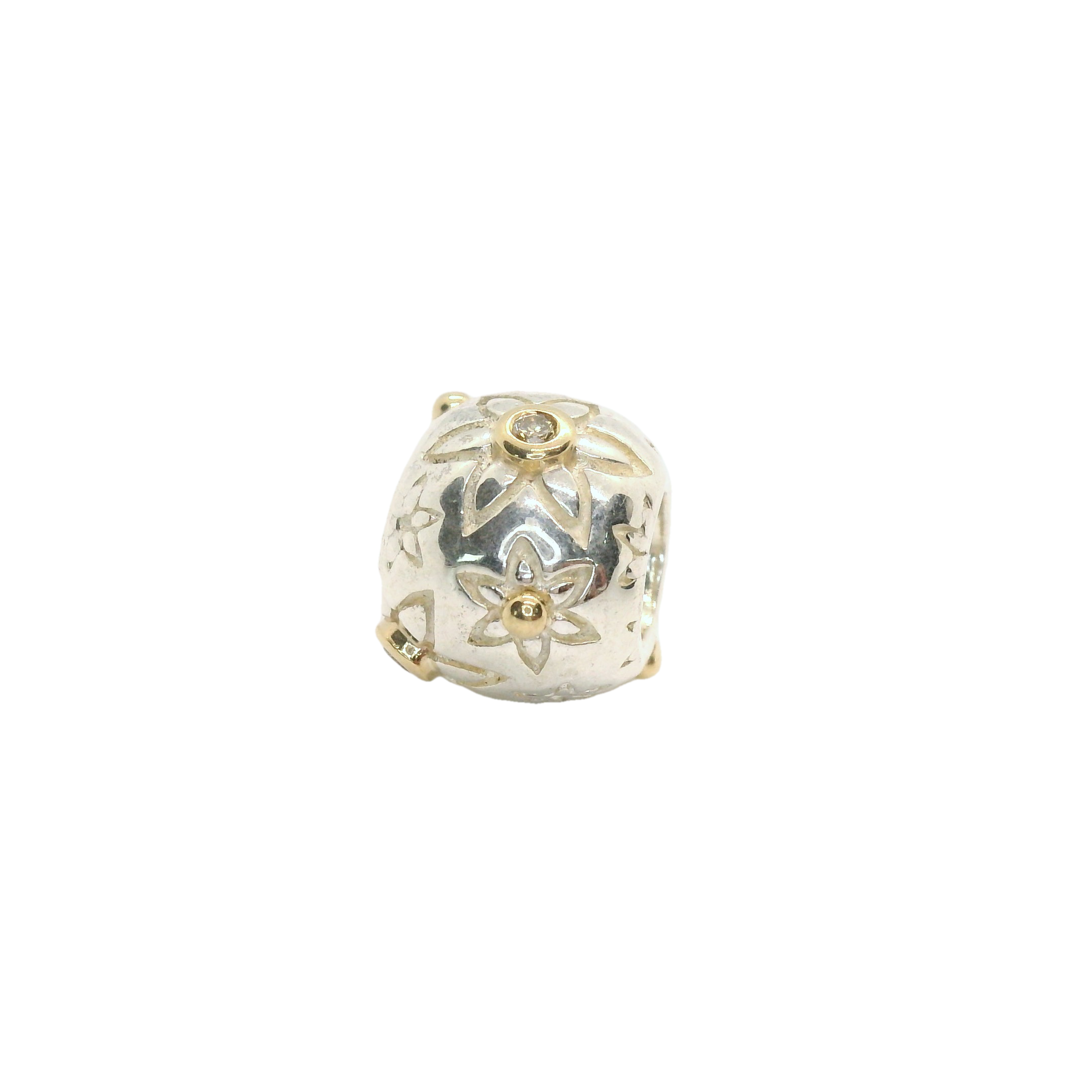 This exquisite silver bead with 14ct accents features intricate floral designs, perfect for adding a touch of elegance to any jewellery piece. Complete with sparkling cubic zirconia’s. Its delicate craftsmanship and shimmering finish make it a standout addition to bracelets or necklaces, offering a timeless charm that complements any style.