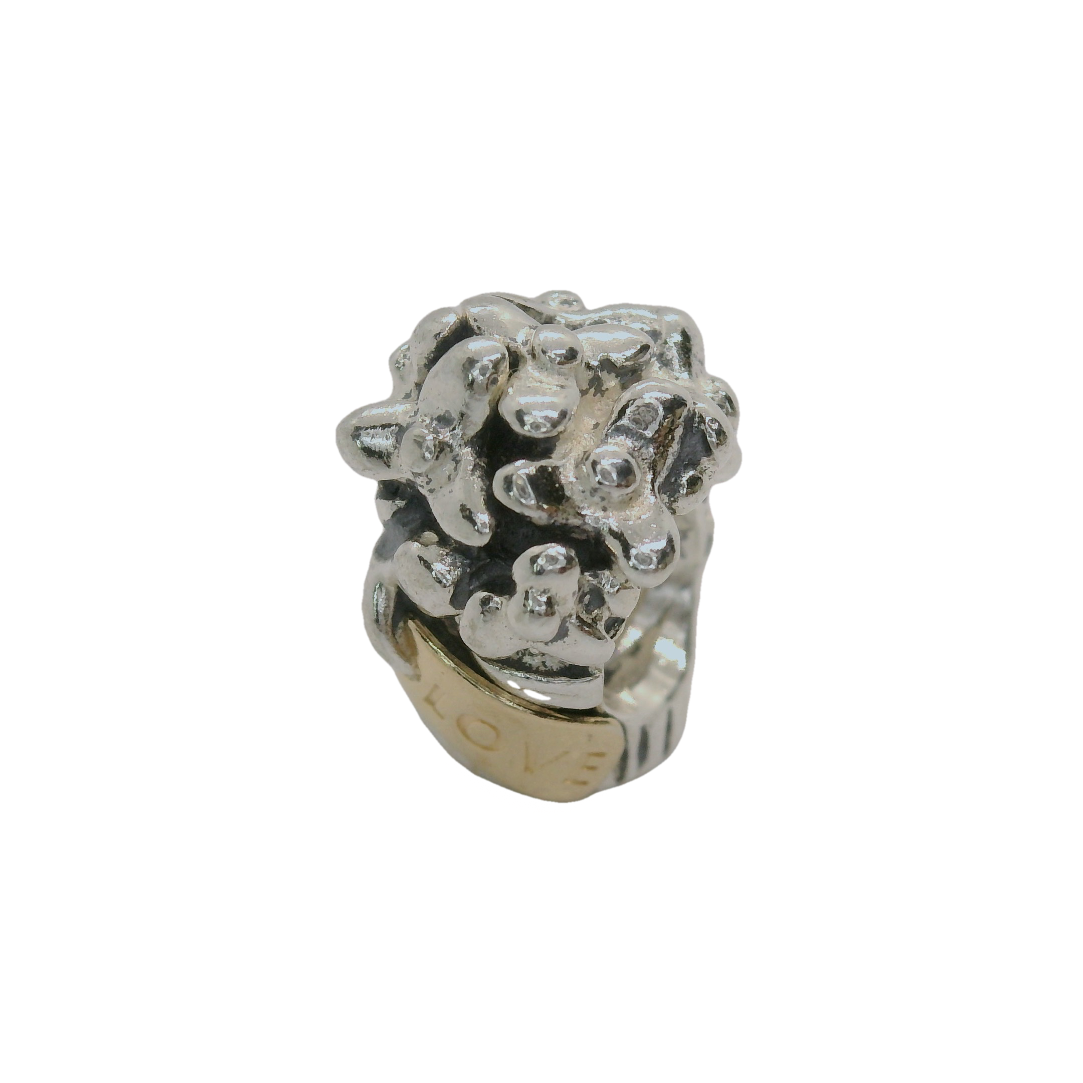 This exquisite charm features a stunning blend of silver and gold, intricately designed to capture the essence of elegance and sophistication. The word 'LOVE' is delicately engraved, adding a personal touch to this timeless piece. Perfect for any occasion, this ring is a symbol of enduring beauty and grace.