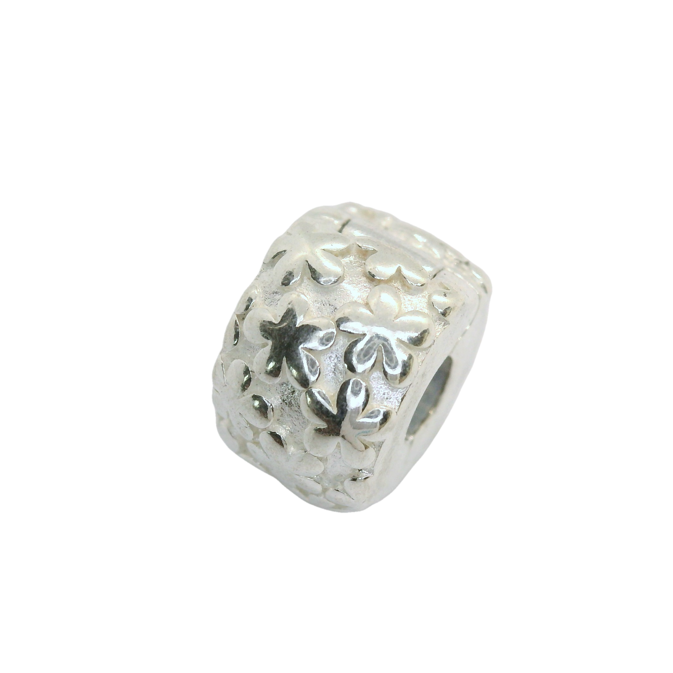 This exquisite silver charm bead features an intricate floral design, perfect for adding a touch of elegance to any bracelet or necklace. Its detailed craftsmanship and lustrous finish make it a standout piece for any jewellery collection.