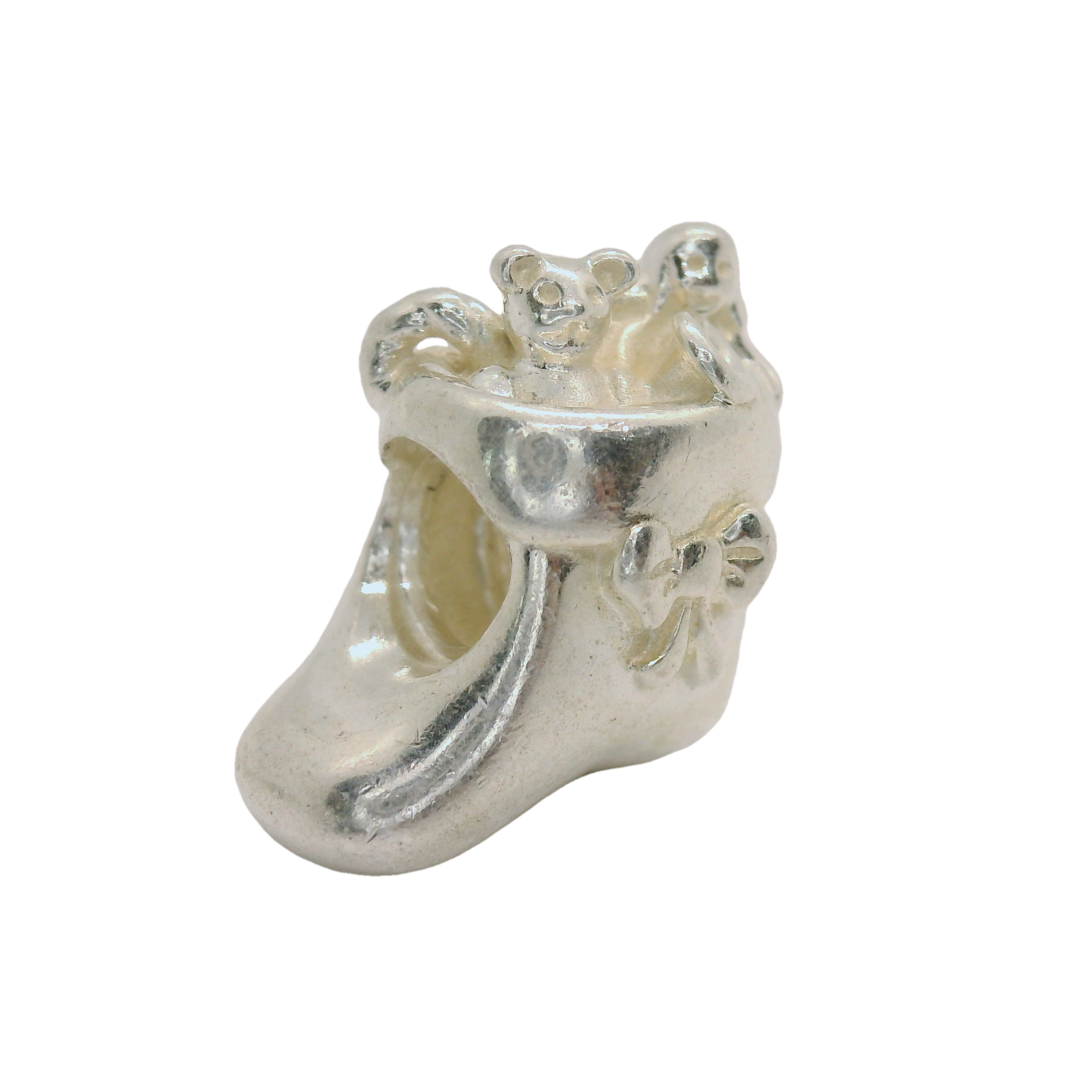 This exquisite silver Christmas Stocking Charm captures the essence of Christmas. Perfectly crafted with intricate details, it features a delicate bow and a tiny teddy bear peeking out, making it an ideal keepsake or a charming addition to any Pandora collection.