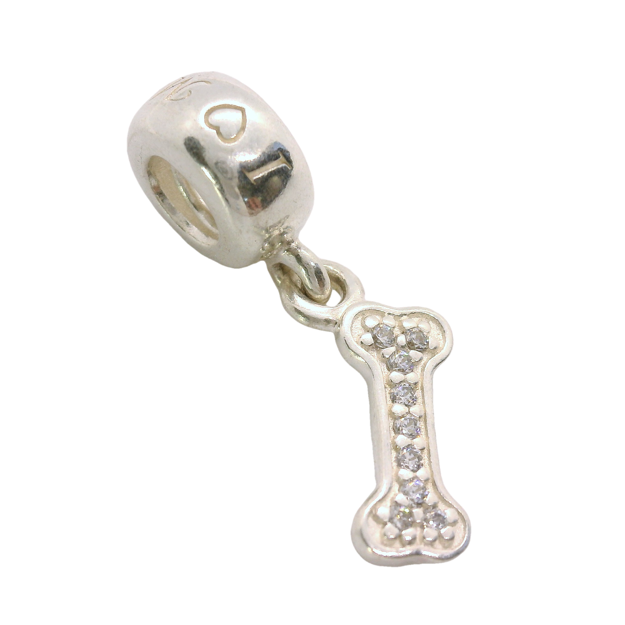 This exquisite bone charm is crafted from high-quality silver, featuring a delicate heart detail on the loop. The bone-shaped charm is adorned with sparkling cubic zirconia's, adding a touch of elegance and sophistication. Perfect for pet lovers or anyone who appreciates unique jewellery, this pendant is a charming addition to any collection.