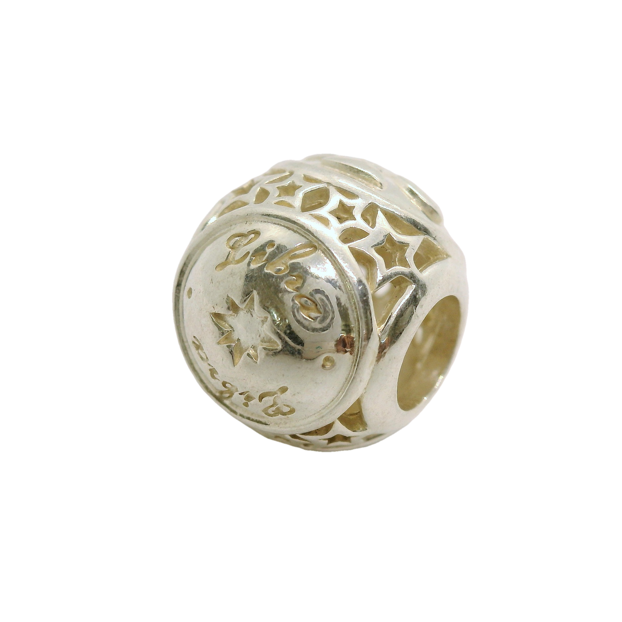 This exquisite silver charm bead features intricate star patterns and elegant Libra engravings, perfect for adding a touch of sophistication to any bracelet. Its polished finish and delicate design make it a versatile piece for any jewellery collection.