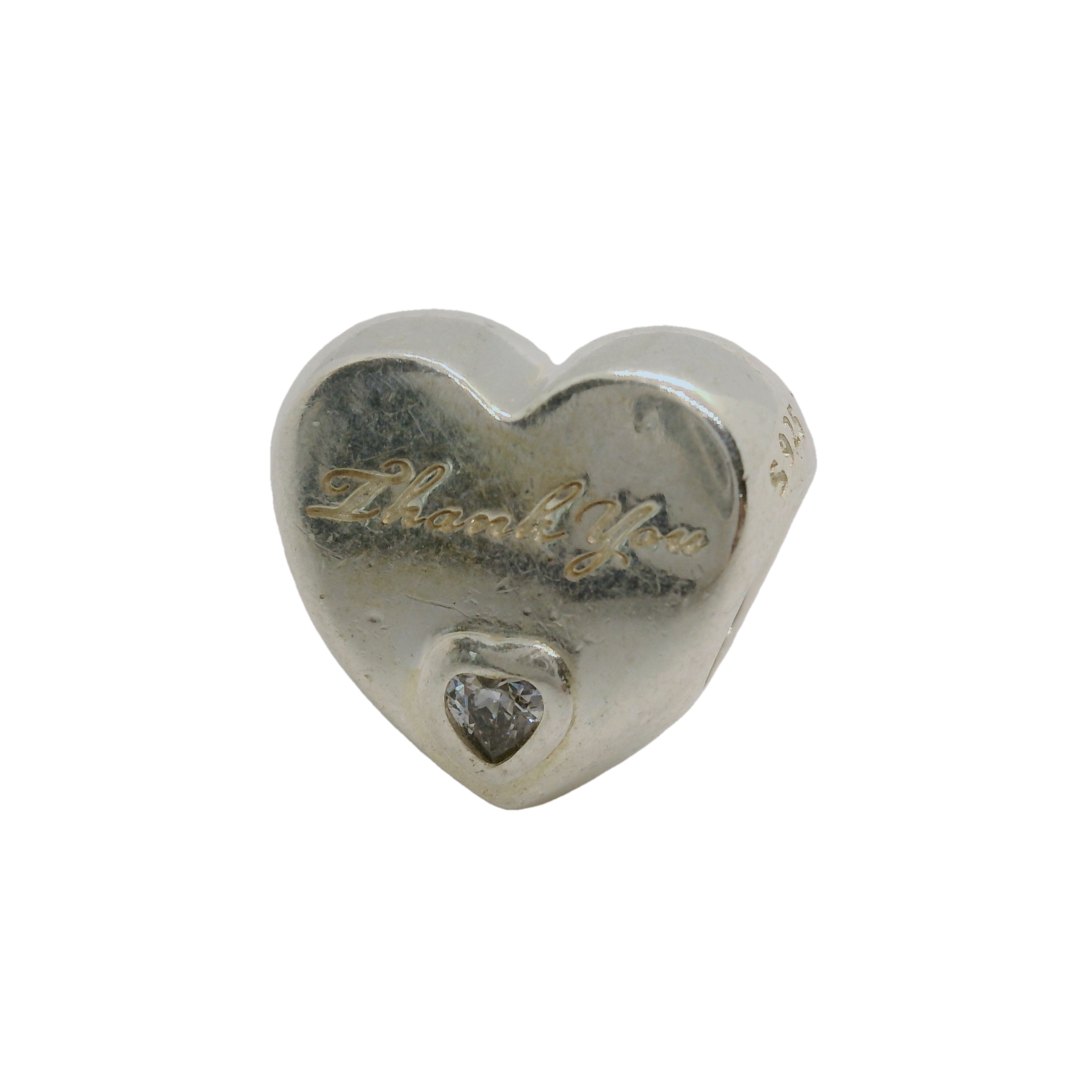 This exquisite heart-shaped silver charm is a perfect token of appreciation. Engraved with the words 'Thank You,' it features a sparkling cubic zirconia that adds a touch of elegance. Ideal for expressing gratitude, this charm can be a cherished addition to any jewellery collection.