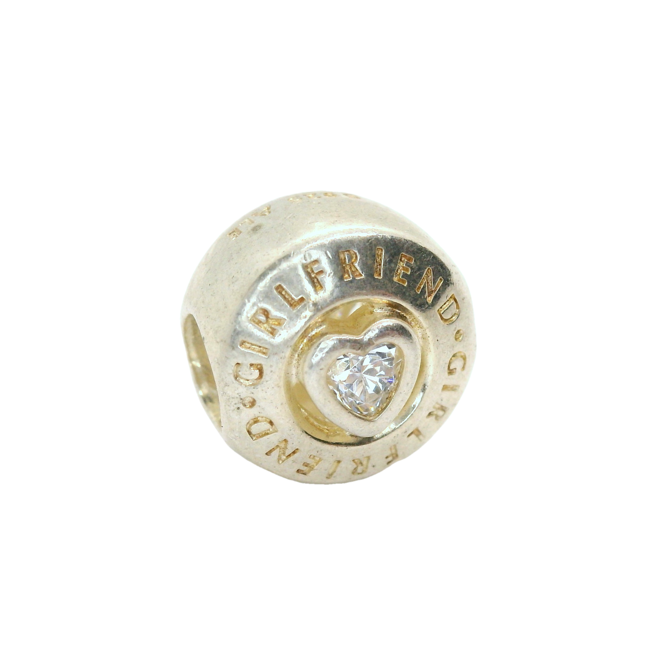 This exquisite silver charm bead is a perfect addition to any bracelet, featuring a sparkling heart-shaped cubic zirconia at its centre. The word 'Girlfriend' is elegantly engraved around the bead, making it a thoughtful gift for a loved one. Its versatile design allows it to complement any jewellery collection, adding a touch of elegance and sentimentality.