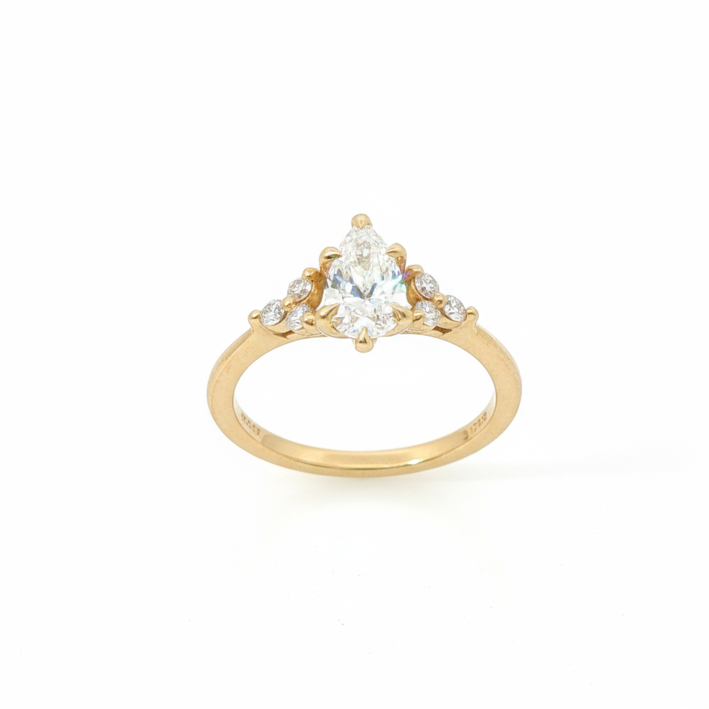 Exquisitely crafted in yellow gold, this ring showcases a mesmerizing pear-cut diamond. This multi-stone ring exhibits excellent symmetry, polish and transparency. The central diamond is complemented by smaller accent diamonds set along the band, enhancing its allure and making it a captivating symbol of refined elegance.