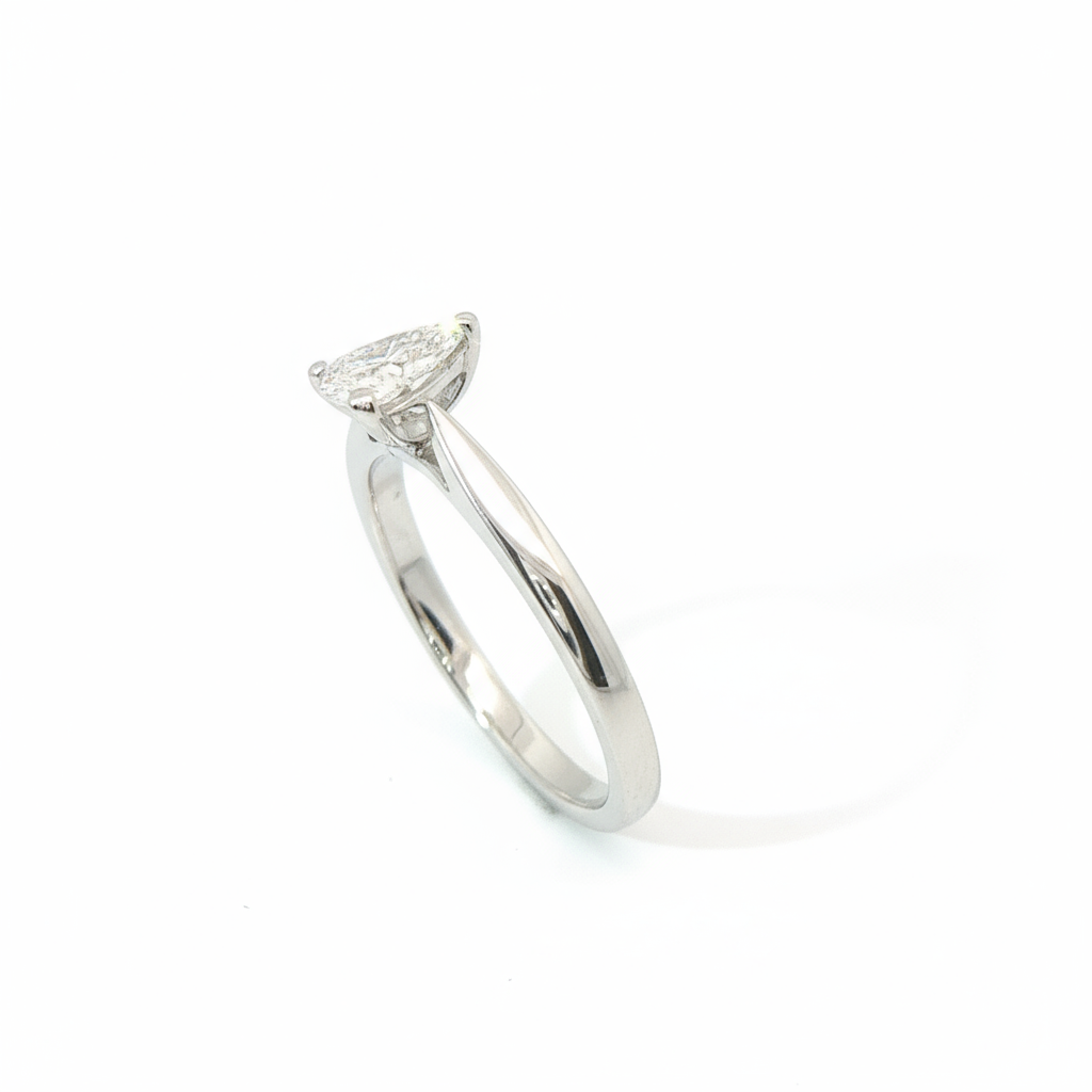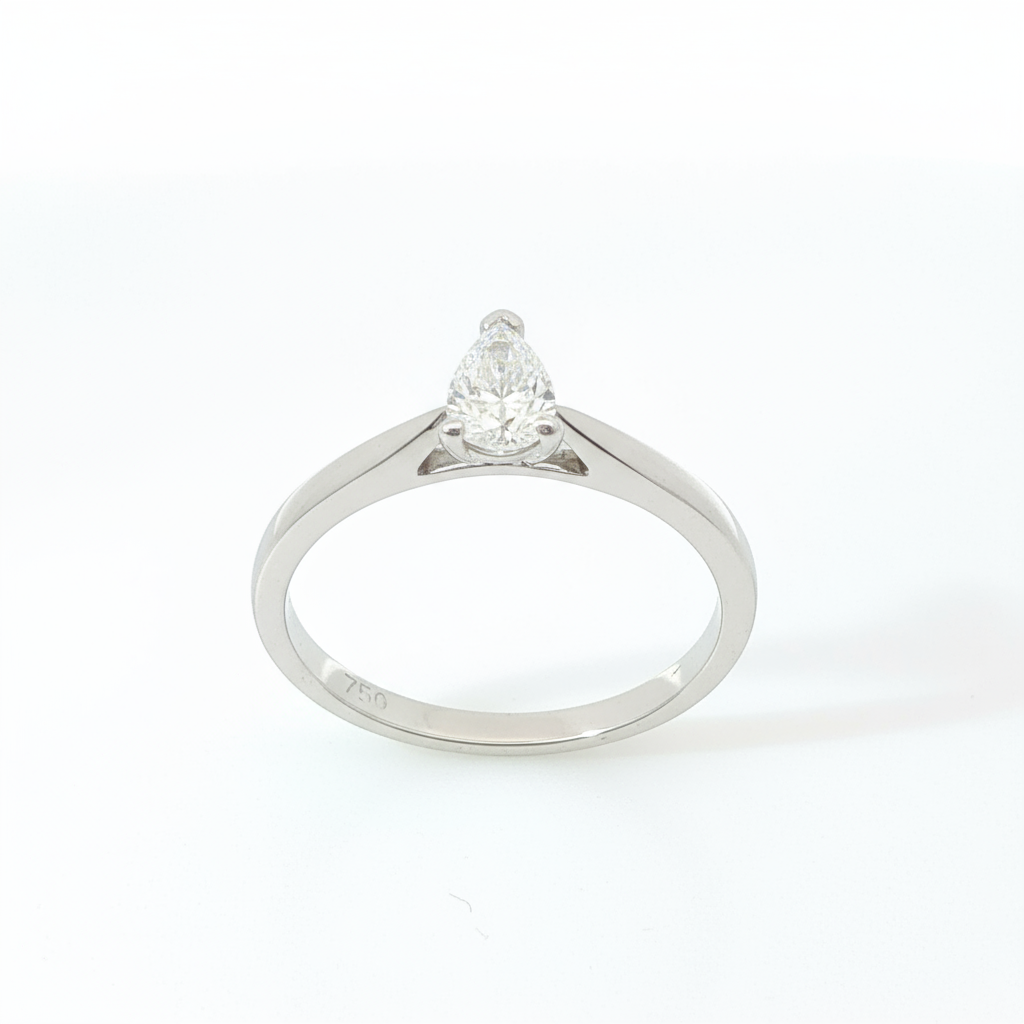 This elegant ring features a 0.5 carat pear-shaped solitaire diamond, graded SI1 to SI2 clarity and H to I colour, set in 18-carat white gold. Its refined design showcases the diamond's brilliance with secure prong settings, making it a timeless choice for those seeking sophisticated understated luxury. Sized at L, it offers a comfortable fit for everyday wear or special occasions.