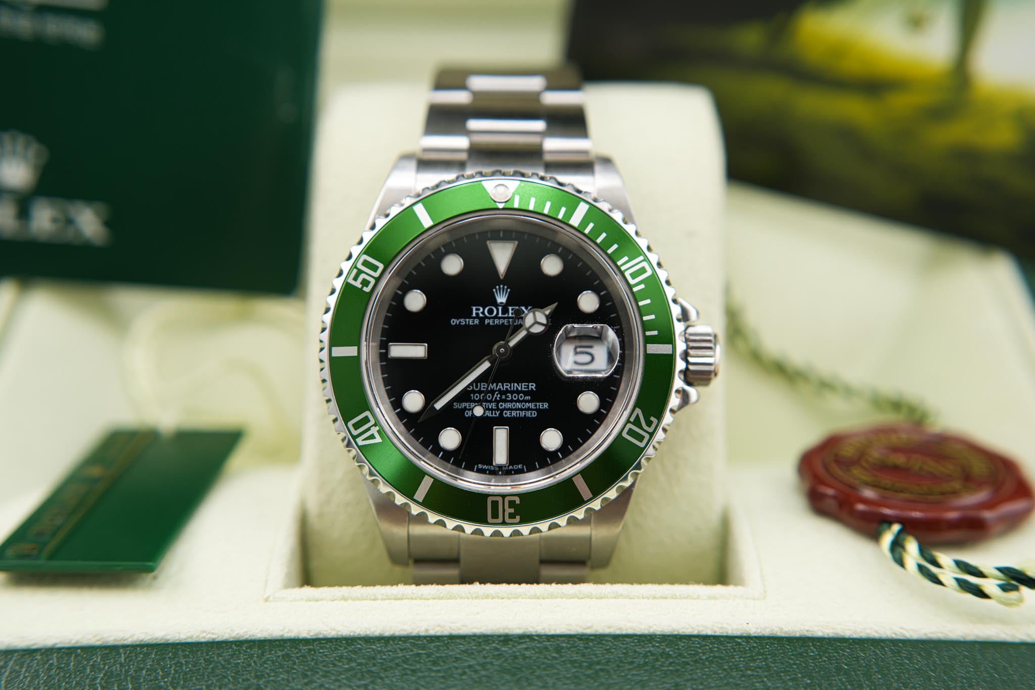 A true modern classic in the Rolex Submariner lineup. The Submariner 16610LV, affectionately nicknamed the “Kermit”, was introduced in 2003 to celebrate the 50th anniversary of the Submariner. Featuring the distinctive green aluminium bezel paired with the classic black dial, this reference has become one of the most collectible Submariners of the modern era.