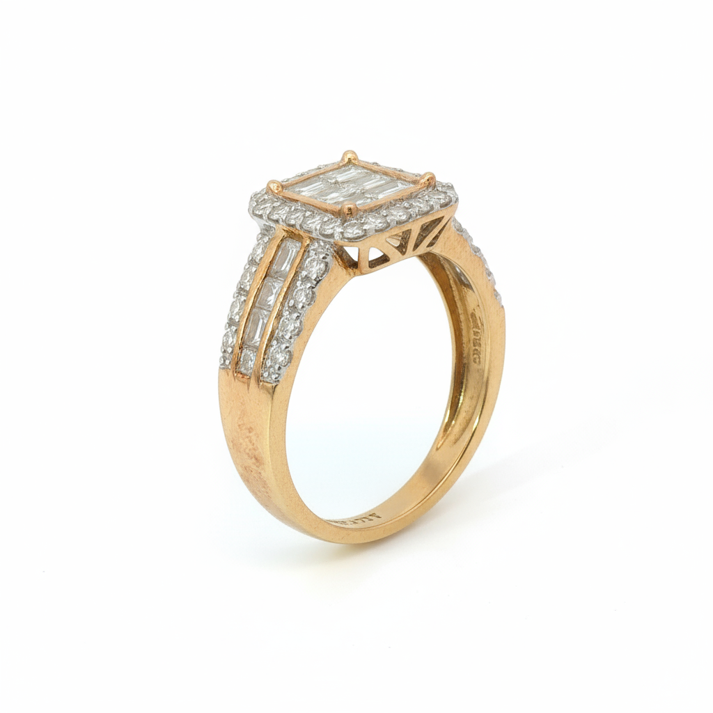 This 9-carat yellow gold halo ring features a striking combination of princess and single-cut diamonds, totaling approximately 1 carat in weight. The diamonds range from SI1 to SI2 clarity and G to H color, creating a balanced brilliance with eye-catching sparkle. Expertly crafted, this size L ring blends classic elegance with modern precision, making it a refined choice for those seeking timeless luxury with exceptional value.