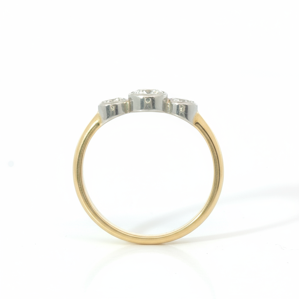 This elegant 18CT yellow gold ring showcases a stunning 0.6CT round brilliant diamond of SI1 to SI2 clarity and H colour, expertly set within a secure three-stone bezel design. Its timeless craftsmanship offers both durability and refined style, making it a sophisticated choice for everyday wear or special occasions. Sized to L, this piece balances classic brilliance with modern practicality.