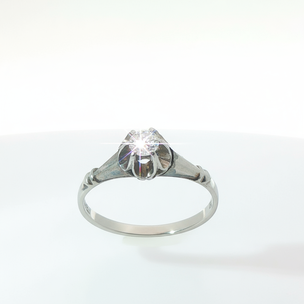This elegant vintage-style ring features a 0.25 carat round brilliant diamond with SI1 clarity and G colour, set in 18-carat white gold. The classic 8-claw setting enhances the diamond’s brilliance while ensuring secure placement. Designed for size N, this piece combines timeless craftsmanship with expert-quality materials, making it an exceptional choice for those seeking refined sophistication.