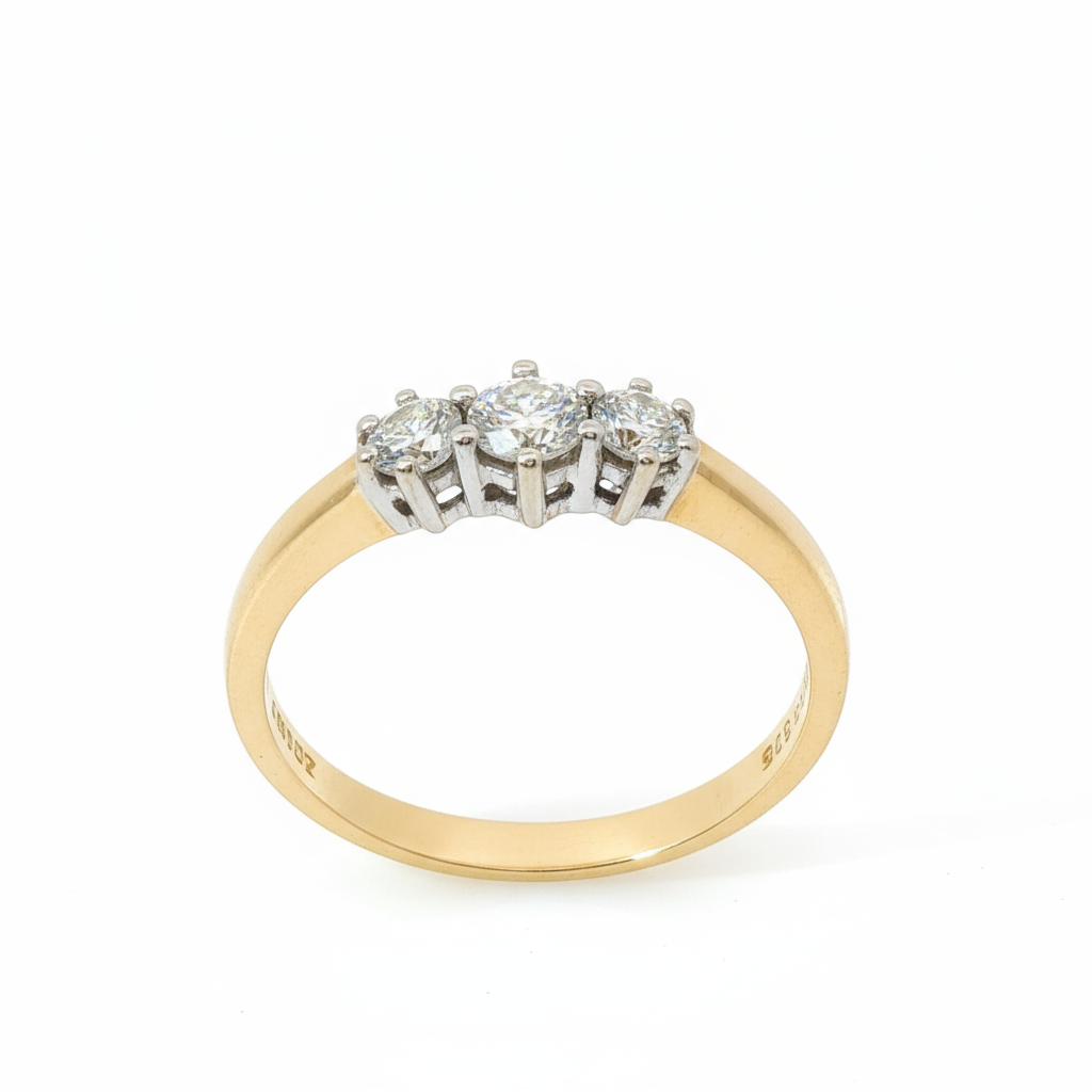This exquisite trilogy ring features three round brilliant diamonds totaling 0.55 carats (two at 0.15 carats and one at 0.25 carats), graded SI1 to SI2 clarity and H to I color. Set in 18-carat yellow gold, the design balances classic elegance with sophisticated sparkle. Sized at T, it offers a perfect fit for those seeking refined craftsmanship and timeless style.