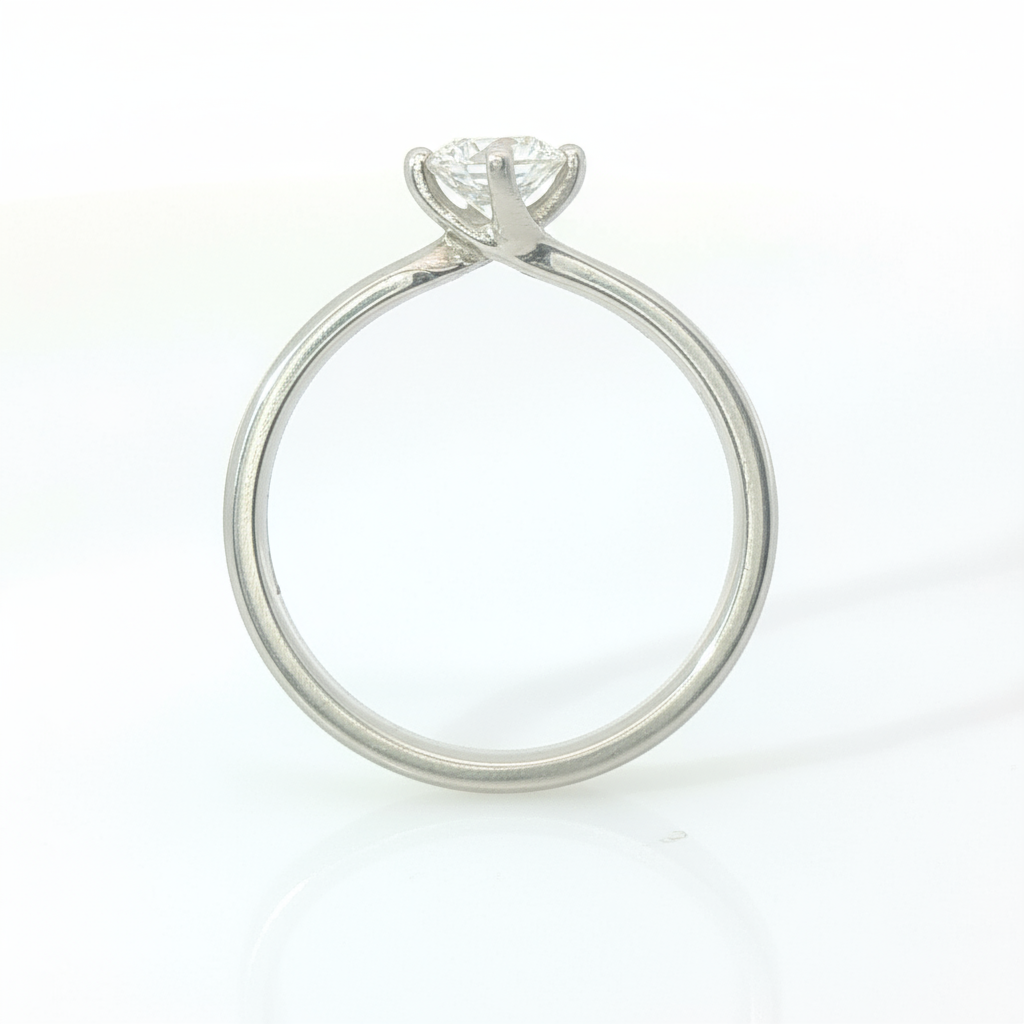 This exquisite ring features a 0.5 carat round brilliant diamond of SI1 clarity and G colour, set in a sleek platinum twisted solitaire band. The design highlights the diamond’s brilliance while offering a modern twist on a classic solitaire style. Available in size M½, it combines durability with elegance, making it an ideal choice for those seeking refined sophistication paired with enduring quality.