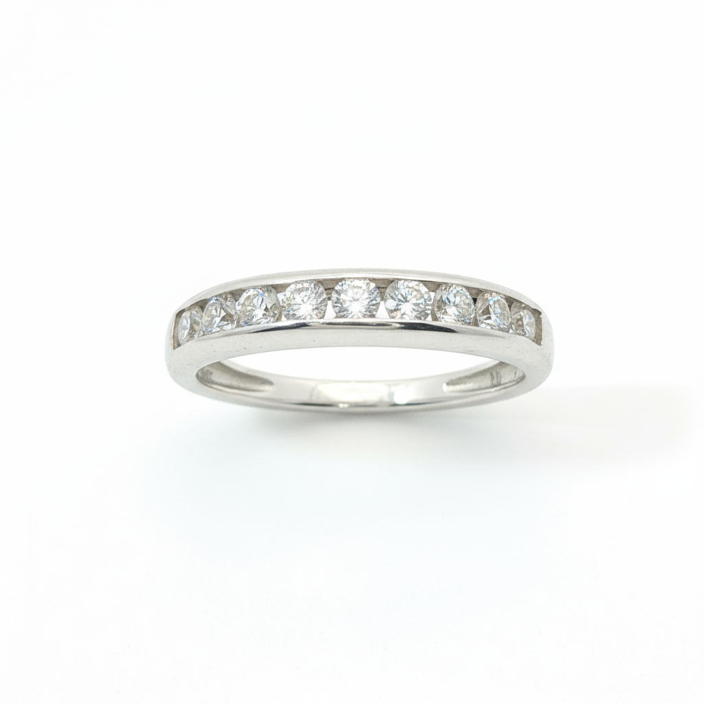This platinum half eternity ring features a 0.5 carat total weight of round brilliant diamonds graded SI1/SI2 clarity and G colour, expertly channel set for lasting security and brilliance. Its refined design offers enduring elegance and versatility, perfect for marking special moments or complementing your everyday style. Sized J 1/2 for comfortable wear, it exemplifies skilled craftsmanship and timeless beauty.