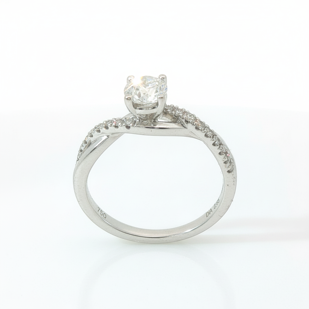 This expertly crafted 18CT white gold solitaire ring features a 0.65 carat round brilliant diamond with clarity ranging from SI1 to SI2 and a color grade of H. The elegant twisted band design adds subtle sophistication, while the precise cut maximizes the diamond’s brilliance. Sized at M, this ring offers a refined balance of classic style and modern detailing, perfect for those seeking enduring quality and understated luxury.