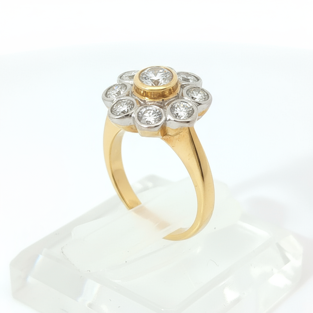 Elevate your collection with this expertly crafted cluster ring featuring 0.85 total carat weight of round brilliant diamonds in SI2 clarity and H-I colour grades. Set in 18-carat yellow gold, the design balances classic elegance with contemporary precision, offering both durability and sophisticated sparkle. Available in size O, this ring combines refined craftsmanship with exceptional value, ideal for those seeking a distinguished yet versatile piece.