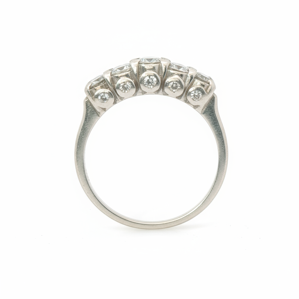 This exquisite five-stone ring features a total of 0.9 carats of round brilliant diamonds, precisely graded SI1 to SI2 clarity and G to H color. Set in durable platinum with secure prong settings, the combination of four 0.15 ct stones and one central 0.2 ct diamond delivers balanced brilliance and refined elegance. Sized at U½, this piece offers timeless sophistication suitable for both everyday wear and special occasions.