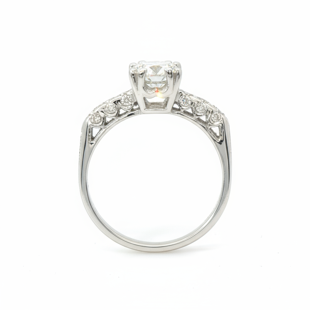 This exquisite 18ct white gold solitaire ring features a stunning 1-carat round brilliant centre diamond graded VS1/VS2 with G-H colour, showcasing exceptional clarity and sparkle. Accentuated by diamond shoulders totalling 0.3ct, this piece balances luxury and sophistication. Designed to impress, it offers enduring elegance and a timeless silhouette, perfect for those seeking expert craftsmanship and refined style. Available in size N.