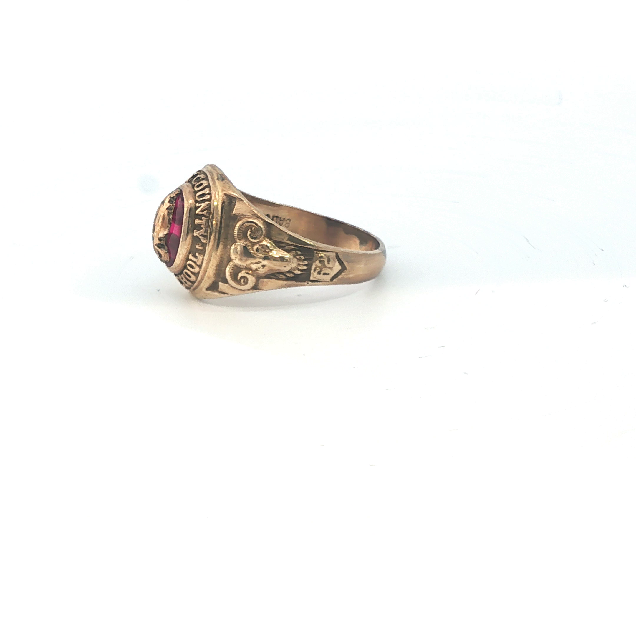 This pre-owned 9ct gold college ring showcases a striking red stone set in a classic design that speaks to tradition and achievement. Weighing 5.74g, the ring combines substantial gold content with elegant proportions, making it a meaningful piece whether worn as a cherished keepsake or statement accessory. The red stone adds distinctive character and colour, whilst the 9ct gold ensures durability for everyday wear. Size N.5 offers a comfortable fit. A distinguished choice for those who appreciate vintage jewellery with heritage appeal.